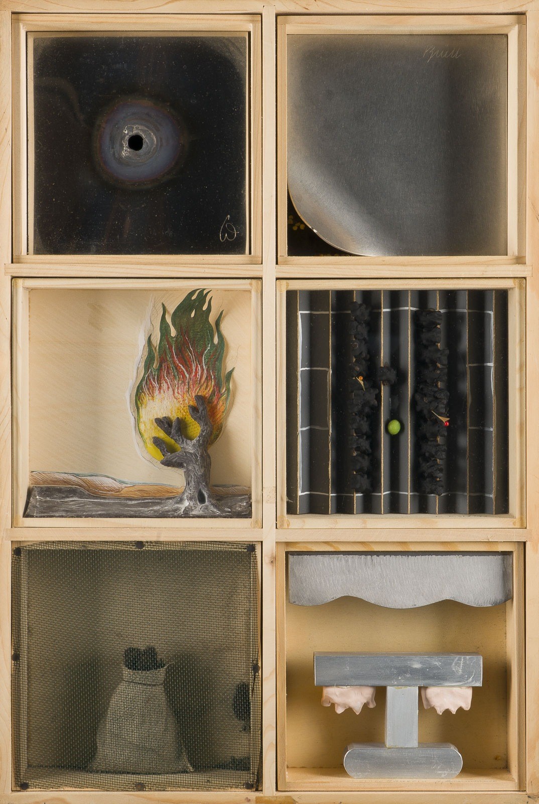 Objektkasten, Multiple, Edition EAT ART Galerie Carlo Schröter, Düsseldorf. 52,8 x 35,3 x 5,3 cm. Jew. sign. bzw. monogr., teilw. dat. und betitelt. Rückseitig mit rotem Stempel bez. 'Eat Art Galerie Carlo Schröter D-4 Düsseldorf Burgplatz 18 Serie I 21/25 Iu.L'. Versch. Materialien und Techniken von 6 versch. Künstlern in 6 Boxen in einem