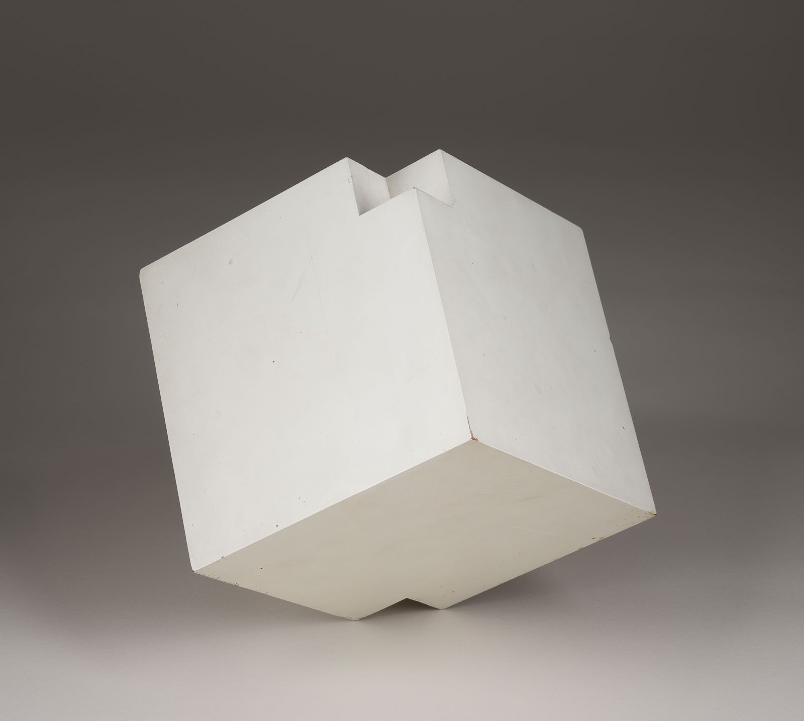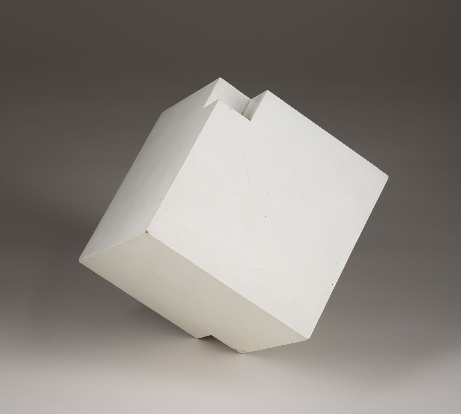 Holzwürfel, weiß lackiert. 20 x 20 x 20 cm. Unsigniert. Modell zur Außenskulptur aus Edelstahl (1975), die sich auf der Grünanlage des