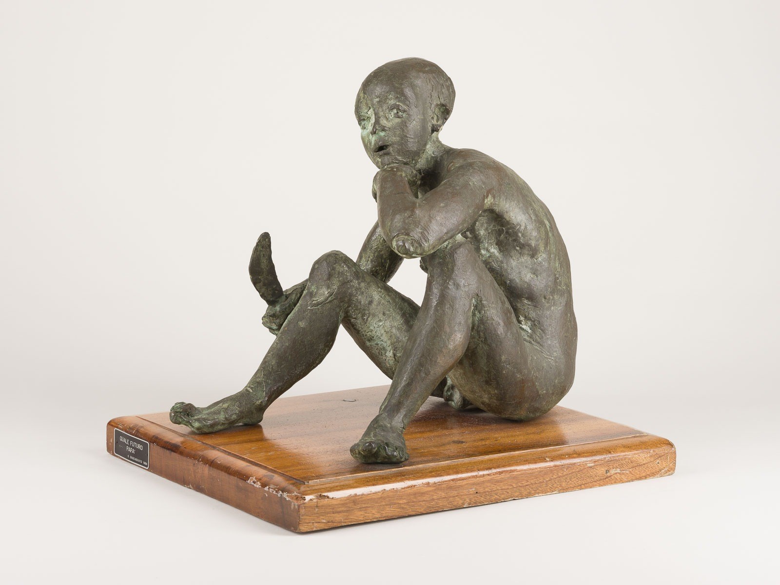 Bronze, dunkelbraun patiniert, auf Holzsockel. Bronze-H. 30,5 cm, Ges.-H. 34 cm, Ges.-Gew. 12,9 k. Am Fuß signiert sowie mit Plakette am Sockel bez. und dat. Mit Oxidationsspuren.