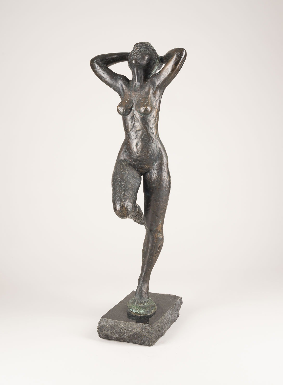 Bronze, dunkelbraun patiniert, auf Steinsockel. Bronze-H. 66 cm, Ges.-H. 72 cm, Ges.-Gew. 18,7 kg. Auf der Plinthe monogram. Part. mit Oxidationsspuren.