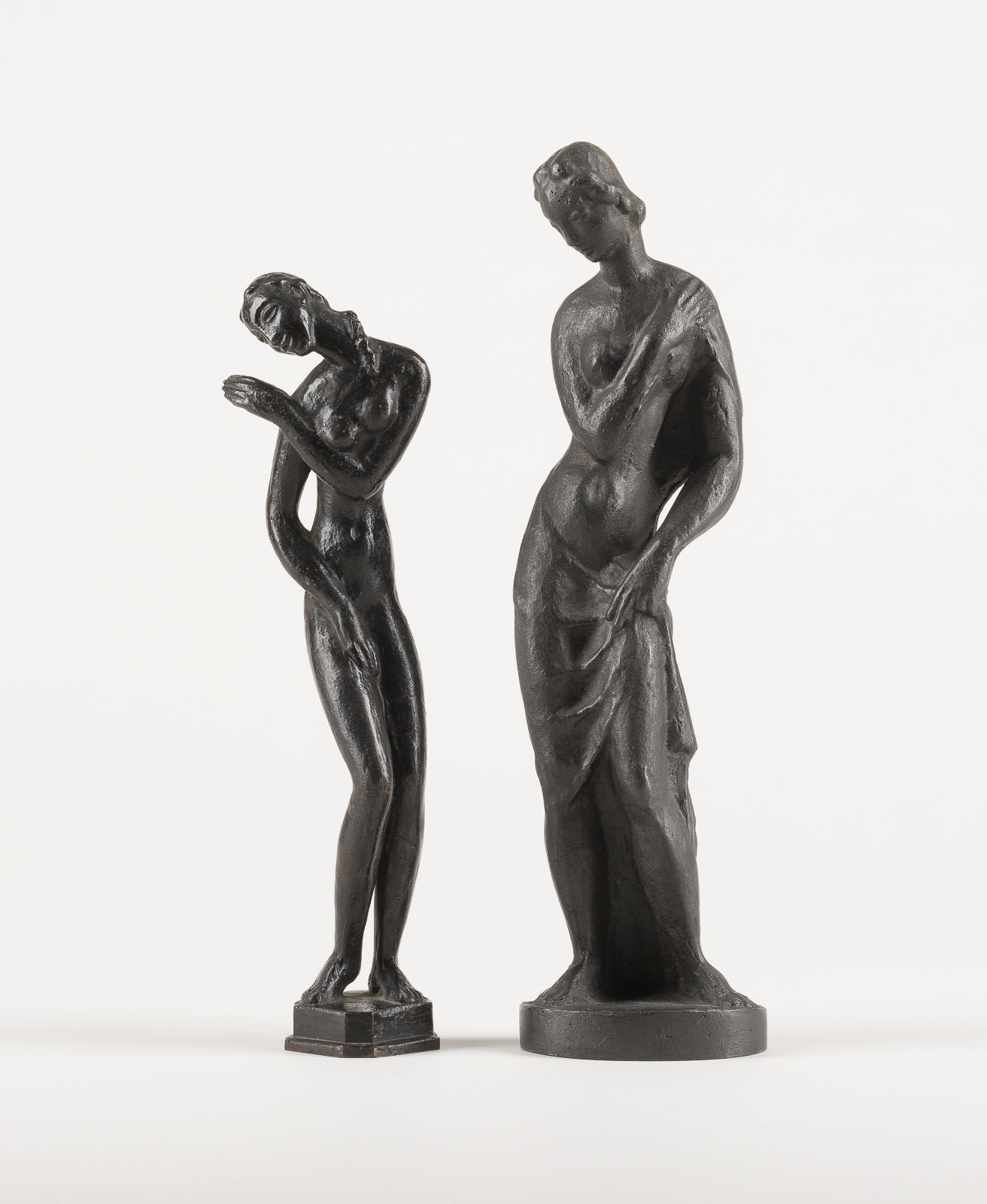 Bronze auf Plinthe, dunkelbraun/schwarz patiniert. H. 23 bzw. 26,5 cm, Ges.-Gew. 2,65 kg. Part. leichte Oberflächenkratzer sowie Verluste der Patina.