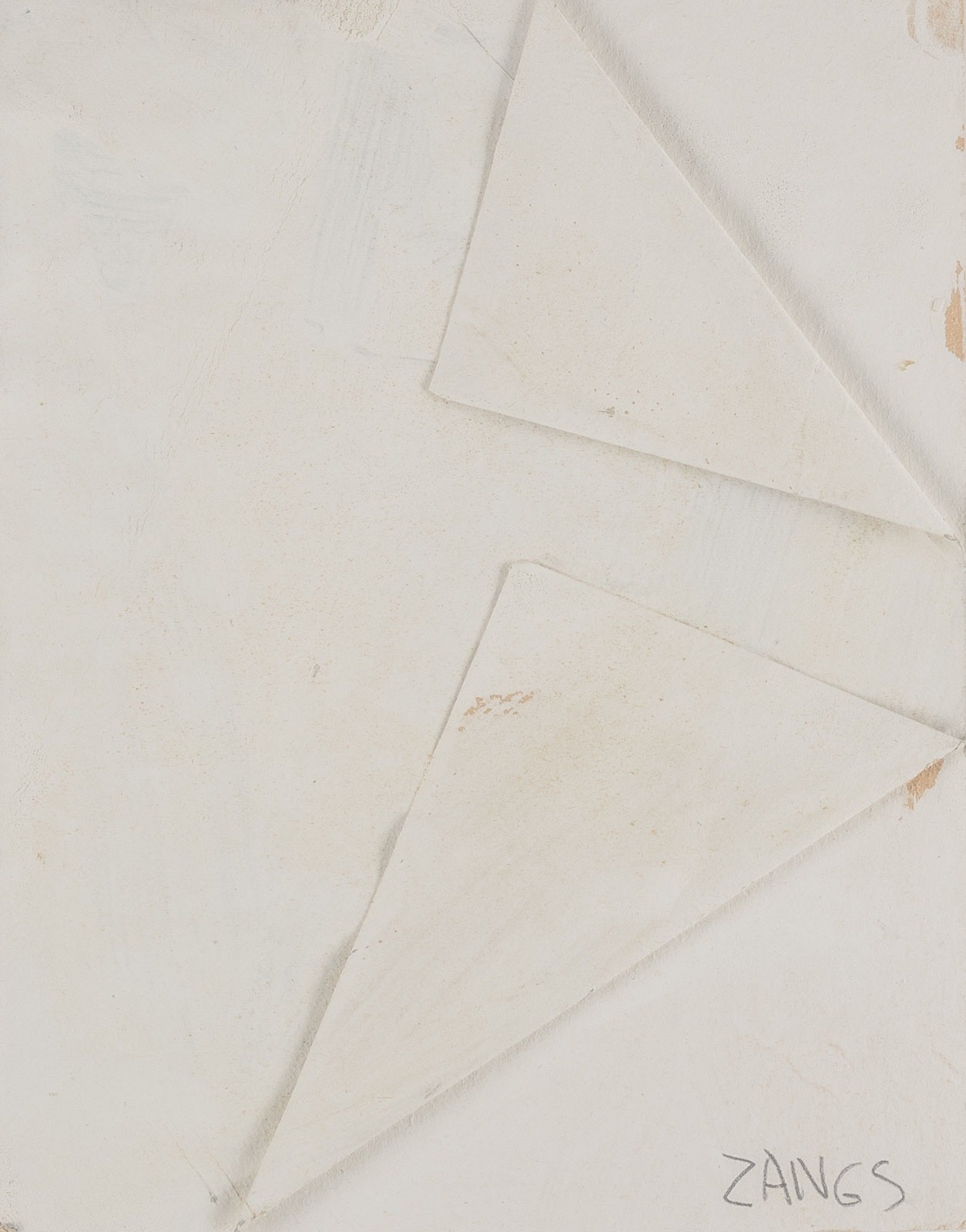 Pappe, gefaltet, mit Dispersionsfarbe bemalt. ca. 27 x 21 cm (R. 50,5 x 44,5 x 4,5 cm). Unten rechts signiert. Altersgemäßer Zustand. Im Objektkasten hinter Glas gerahmt (ungeöffnet).