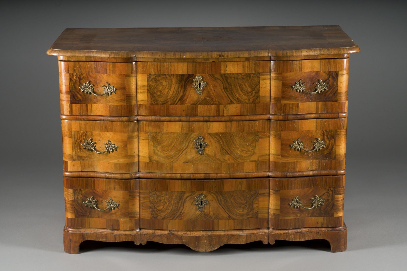 Nussbaum, Nadelholz, furniert, Bandintarsien, dreischübig, vergoldet Bronzebeschläge. H. 85, B. 118, T. 60 cm. Passig bewegter dreischübiger Korpus und überstehende Deckplatte Part. best.
