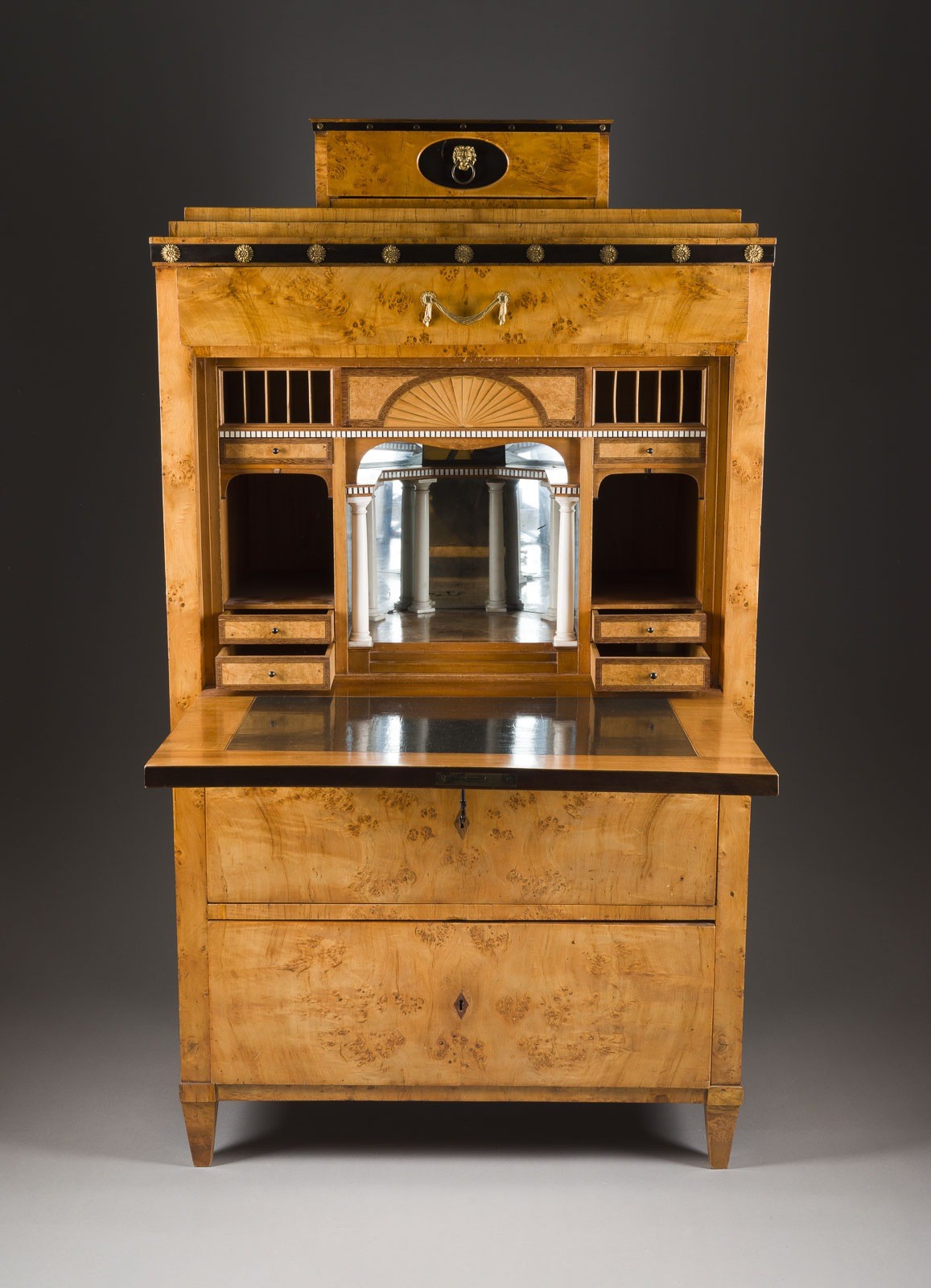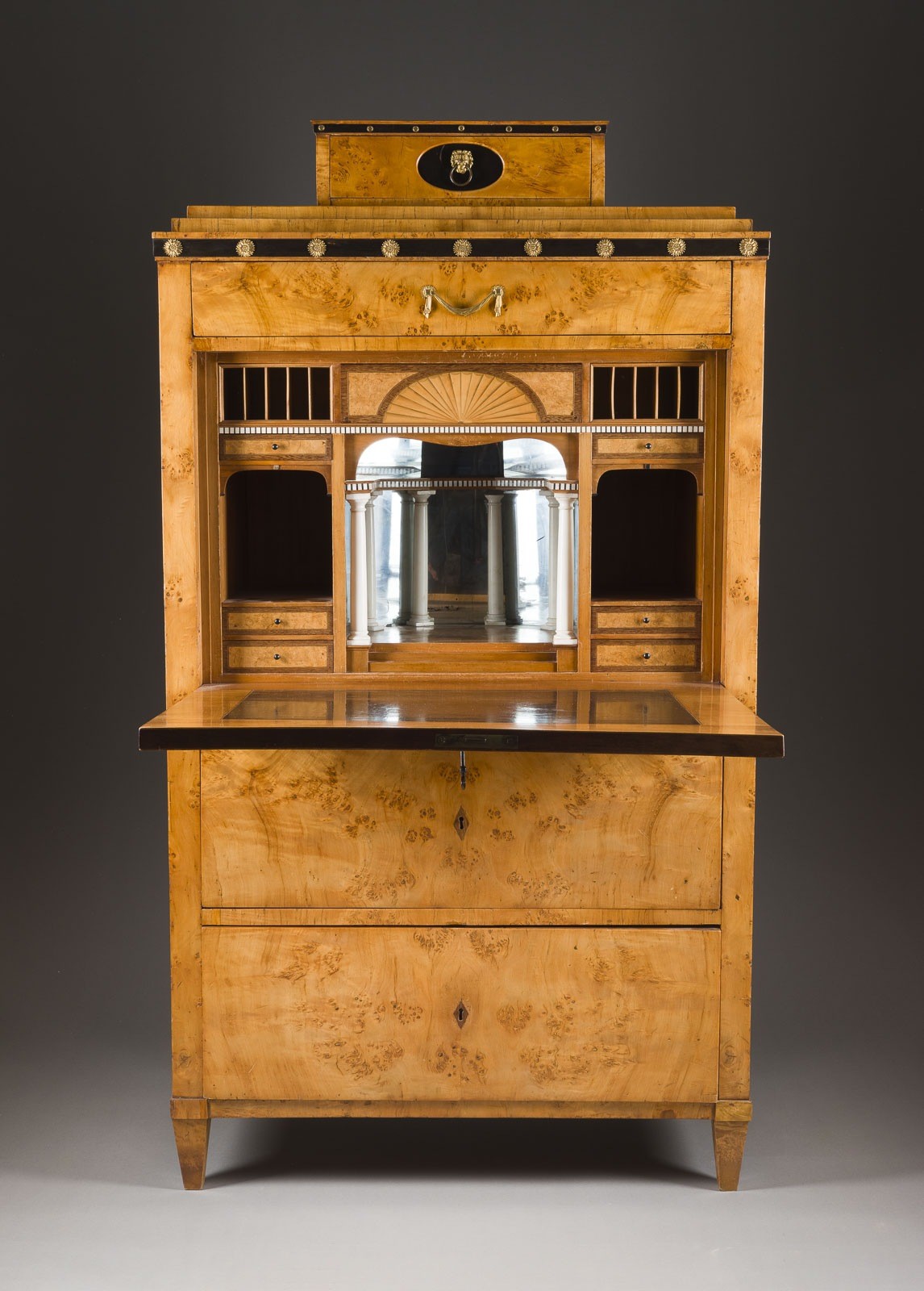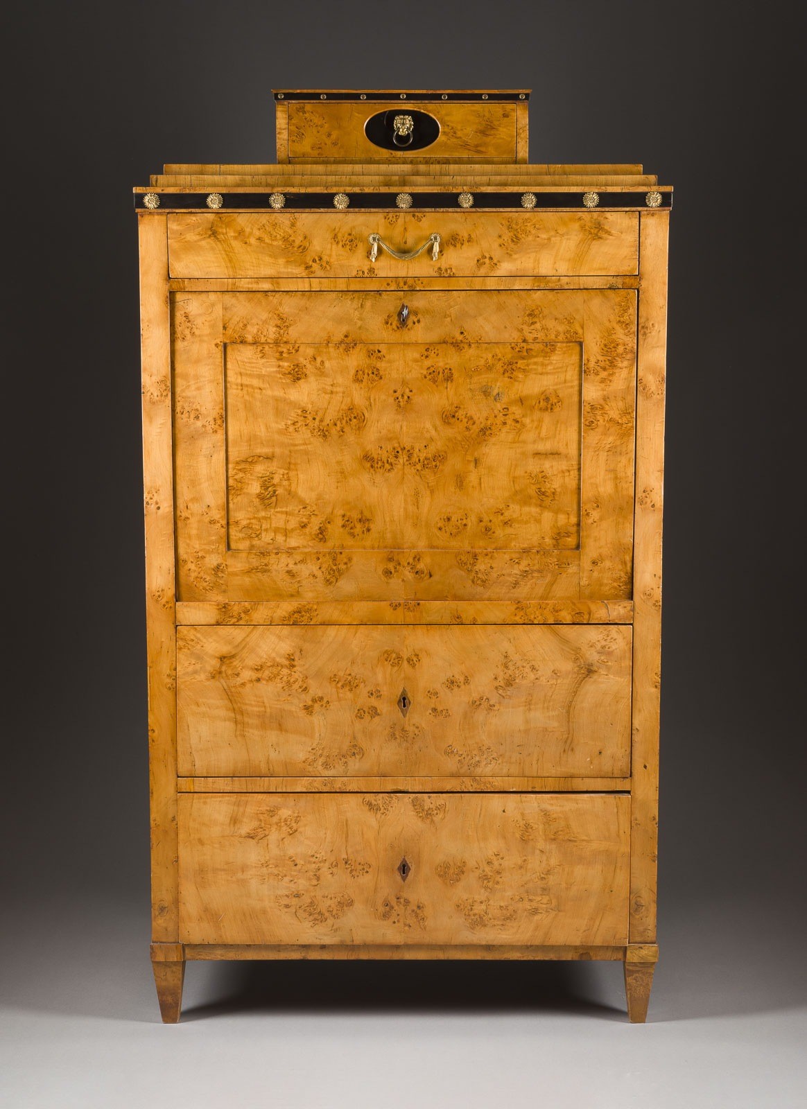Pappelmaser auf Nadelholz und Linde furniert, feuervergoldete Bronze, auf Vierkantfüßen. H. 160, B. 88, T. 43 cm. Front 3-schübig, aufklappbare Schreibplatte, innen aus Birnbaum und Ebenholz, Innenleben