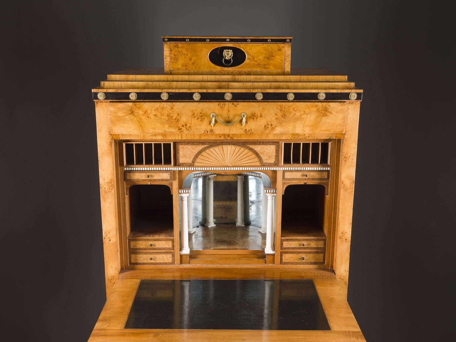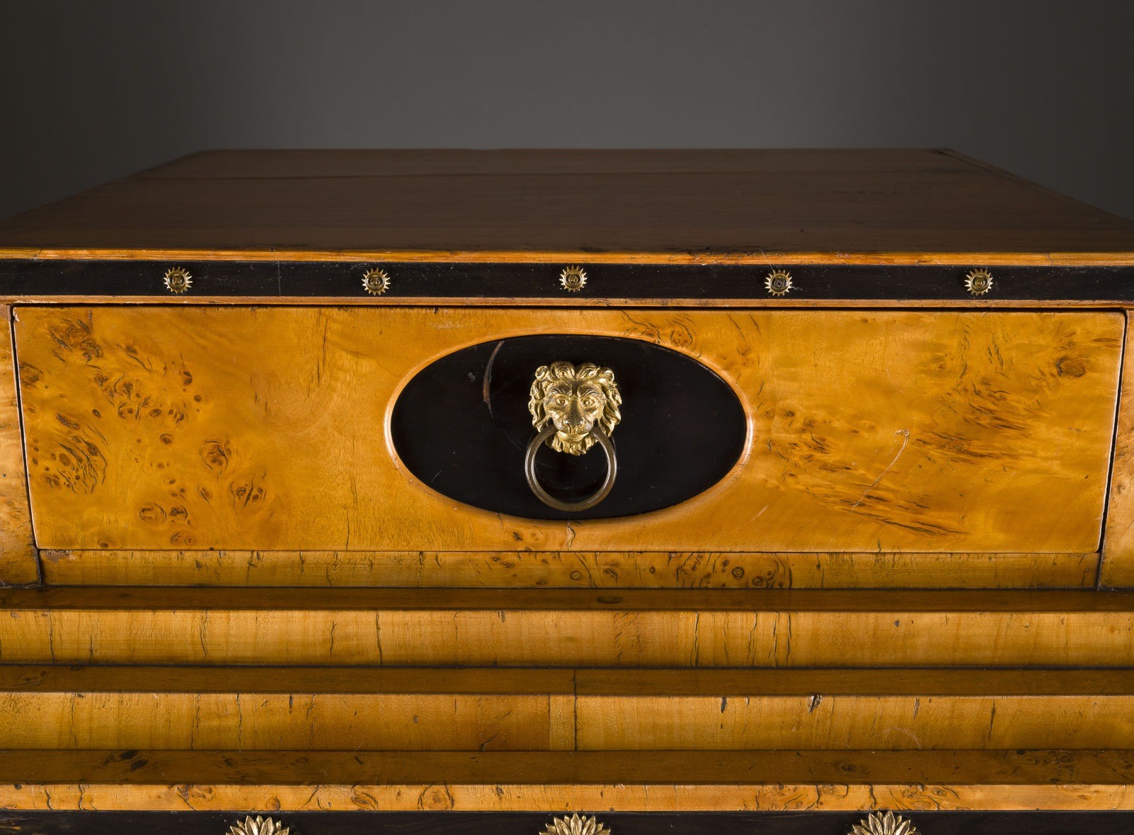 ausgewählten Pappelmaserfurniere wird durch die feuervergoldeten Bronzeappliken