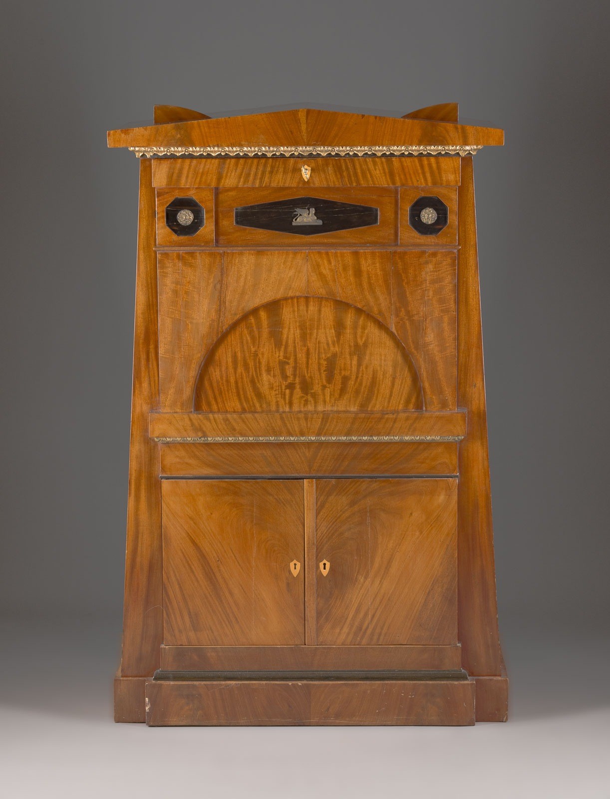 Mahagoni auf Tannenholz furniert, poliert. H. 143, B. 90, T. 53 cm. Seltenes Biedermeier-Möbel in pyramiden-/trapezförmiger Ausführung: Auf rechteckigem Stand