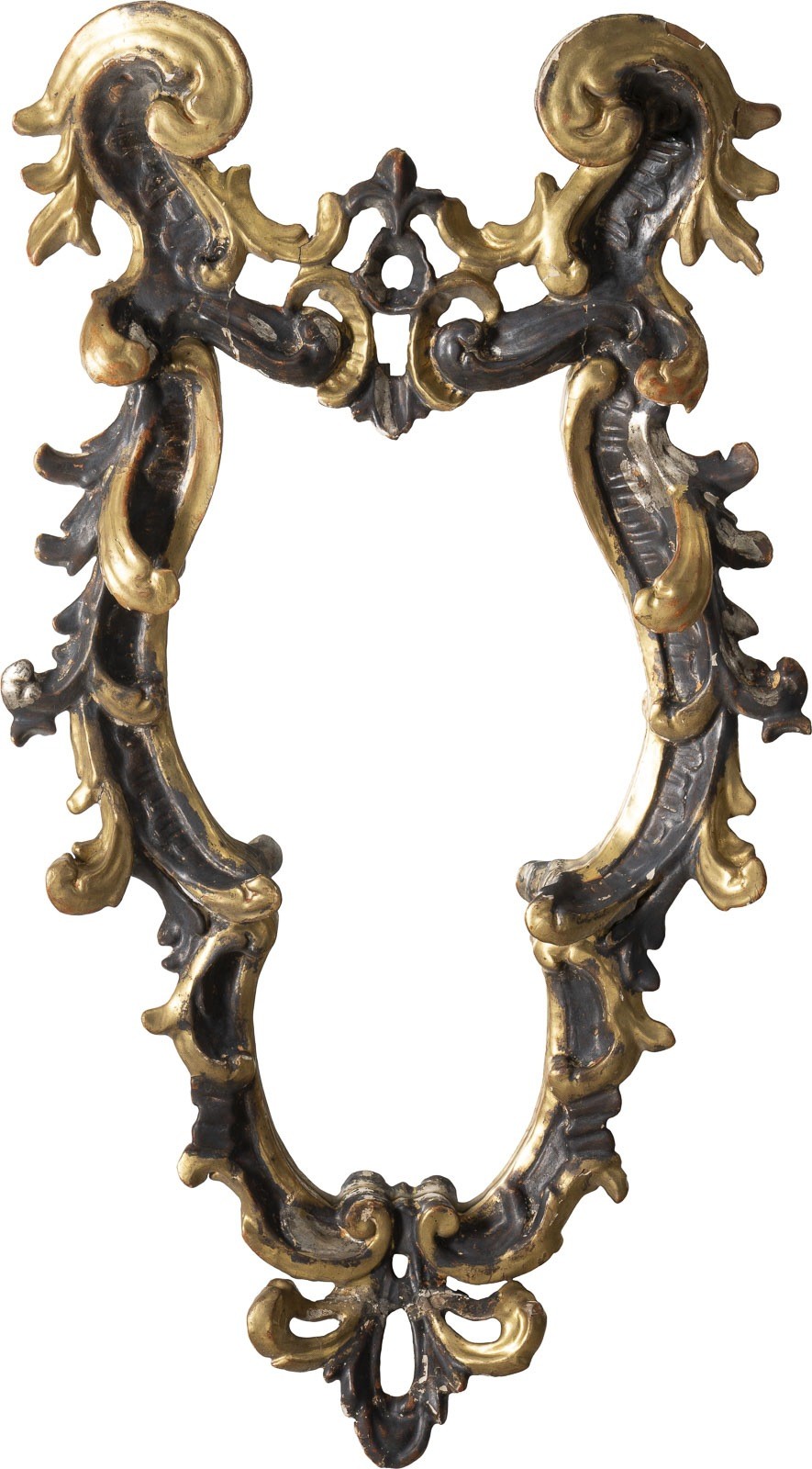 Holz, geschnitzt, polychrom gefasst und vergoldet, mit reichem Floraldekor, Spiegelglas. H. 80, B, 45, T. 10 cm. Part. best. und Fassungsverluste.