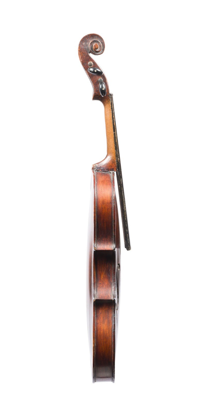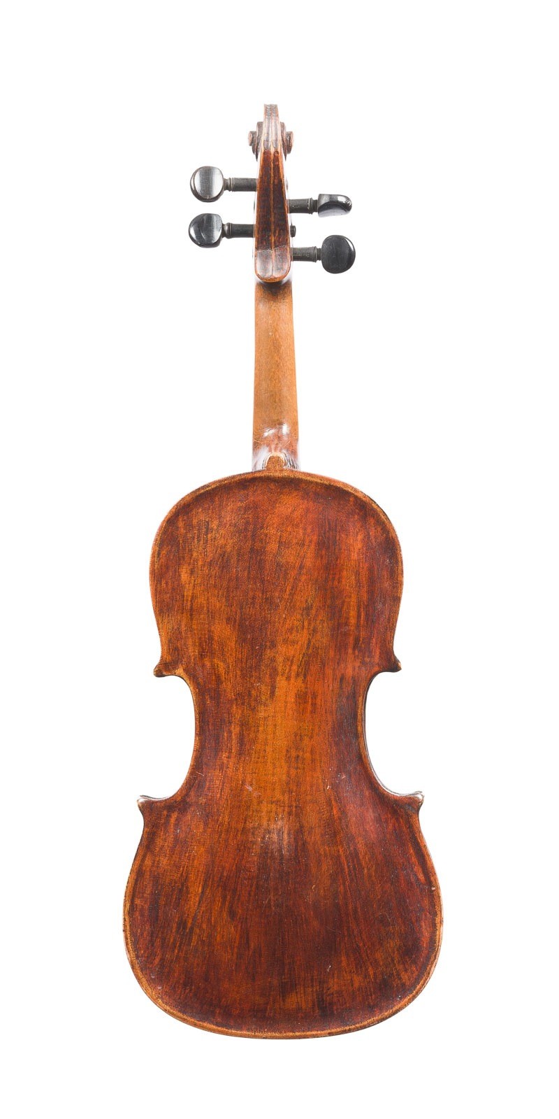 Einteilige Fichtenholzdecke und geflammter Ahornboden, dunkelbrauner Lack. 3/4 Geige, L. 54, Korpusl. 32,9 cm. Ungemarkt. Part. best., rest, Deckenriss.