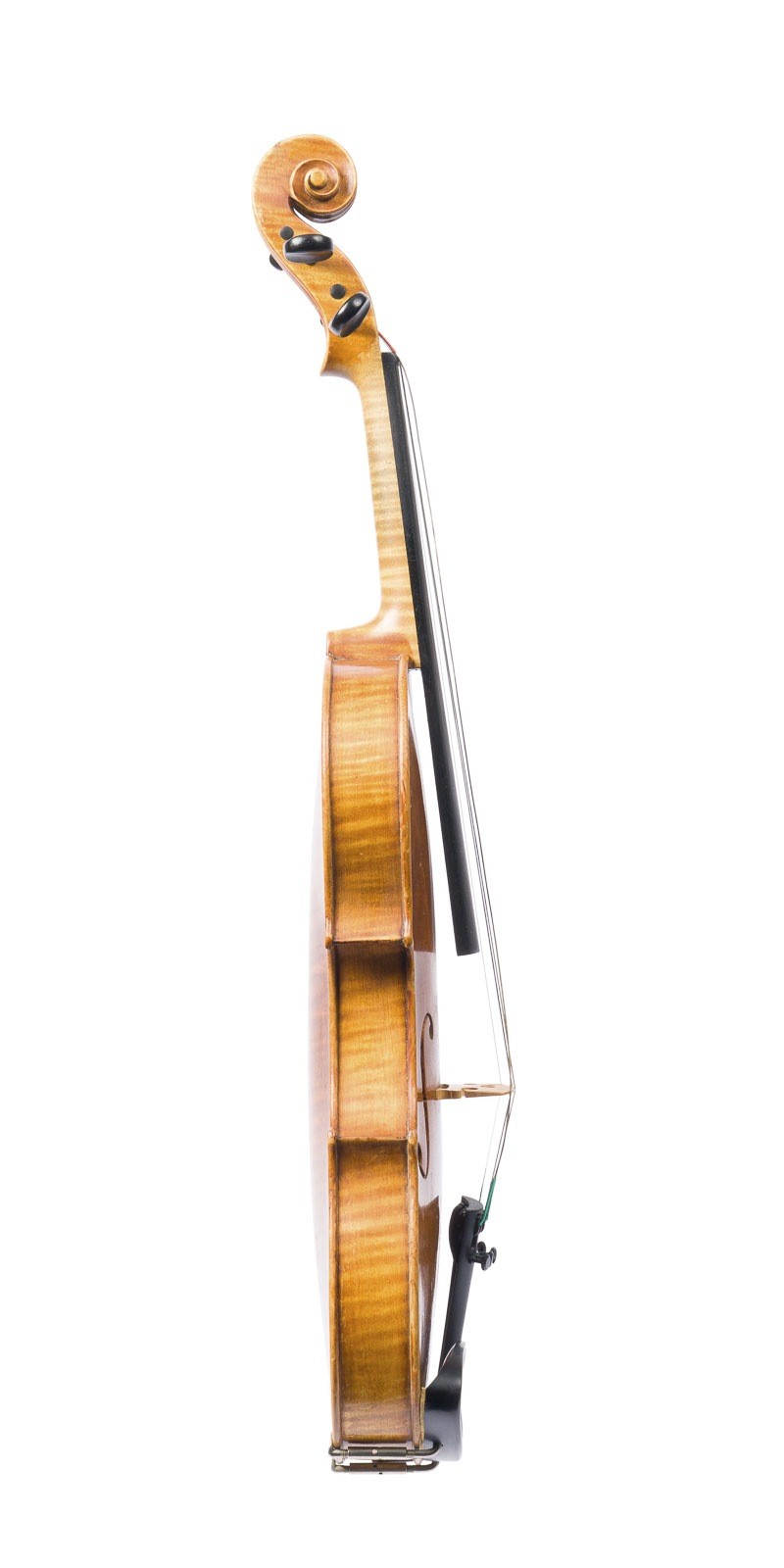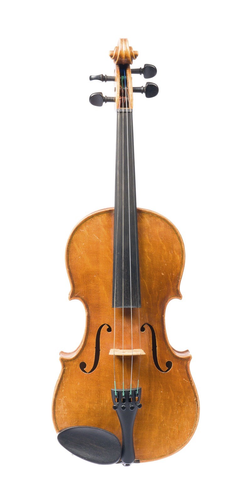 Zweiteilige Fichtenholzdecke und einteiliger geflammter Ahornboden, hellbrauner Lack, mit Tasche. 3/4 Geige, L. 55,9 cm, Korpusl. 33,4. Min. best. und rest.