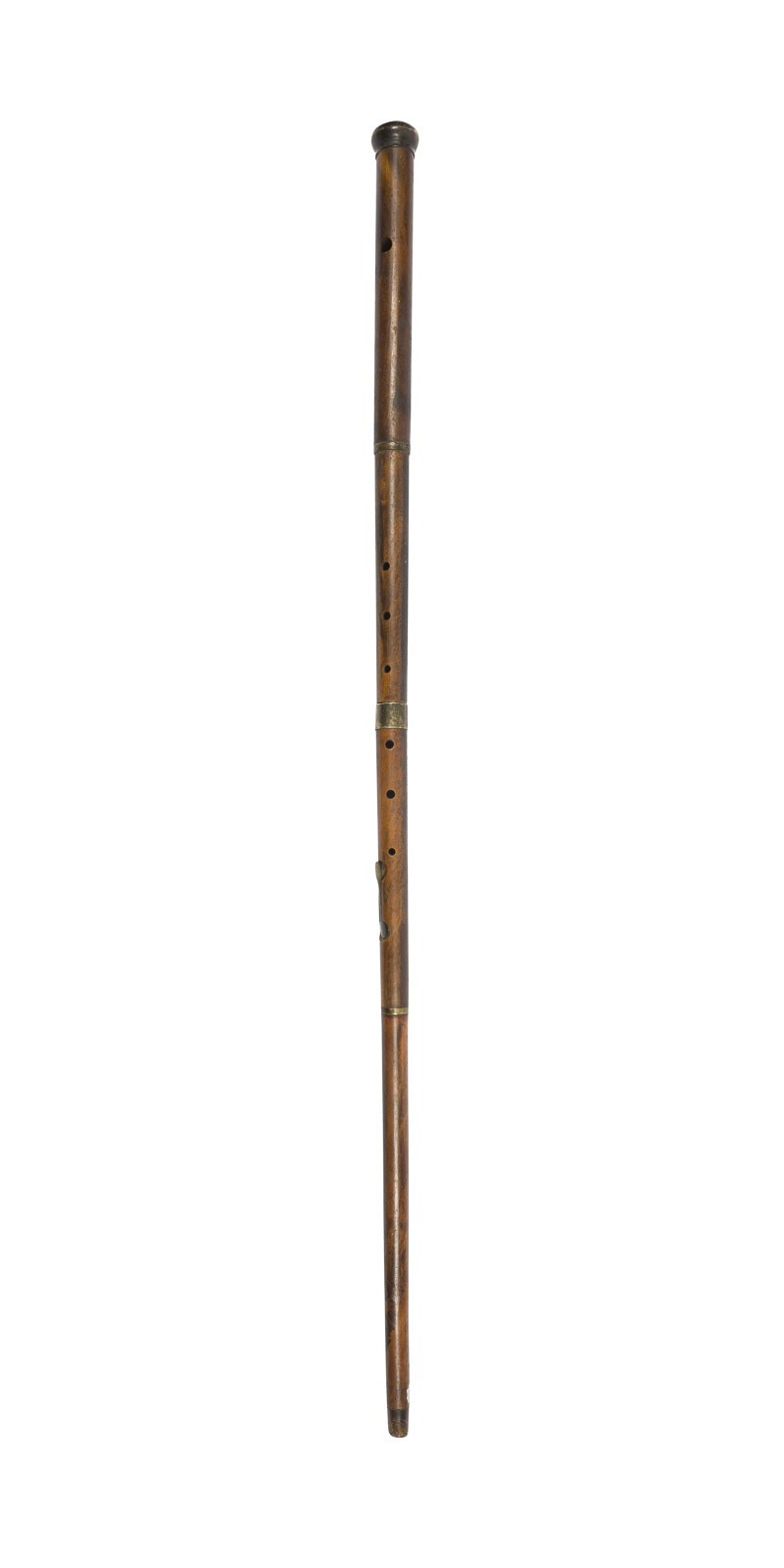 Holz, sieben Vorderlöcher, Daumenloch. L. 88,5 cm. Ungemarkt. Historisches Holzblasinstrument in Form eines Csakan, auch als Stockflöte oder