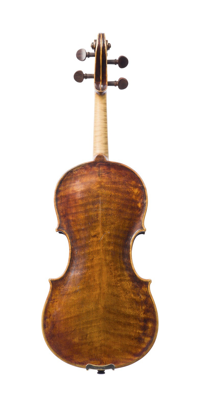 Einteilige Fichtenholzdecke und zweiteiliger Ahornboden, dunkelbrauner Lack, mit Koffer. 4/4 Geige, L. 59,3 cm, Korpusl. 36 cm. Ohne Geigenzettel. Zwei Violinbögen, jeweils runde Stange, Einfach Auge, Wicklung, Elfenbeinkopfplatte, L.