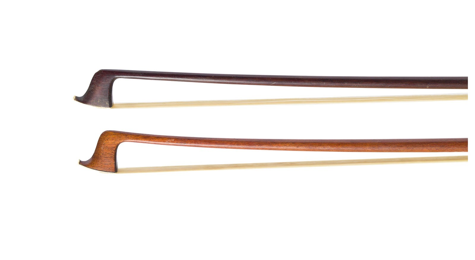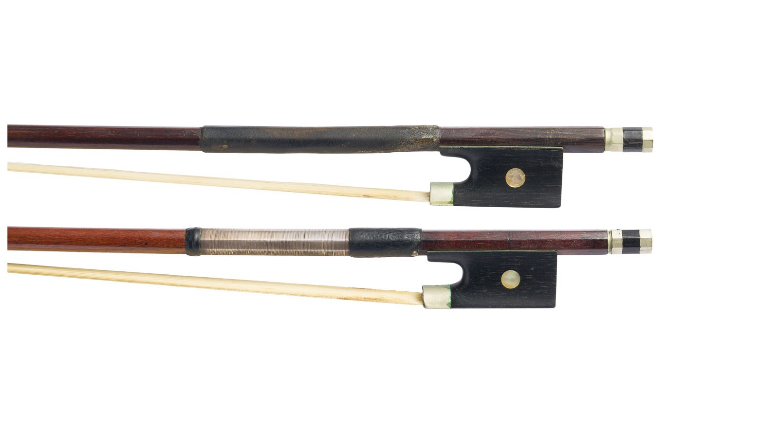 73,3 und 74,5 cm, Gew. ca. 56g und 58g, Geigenbogen ungemarkt, part. best. und ber. Violine part. ber. und best., rest., spielbereit.