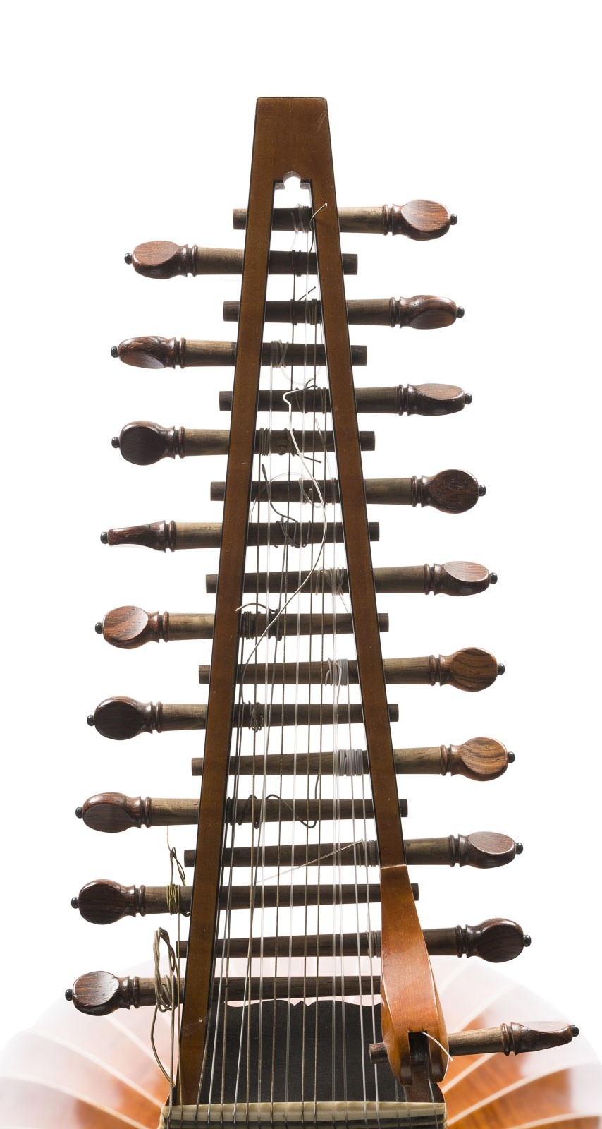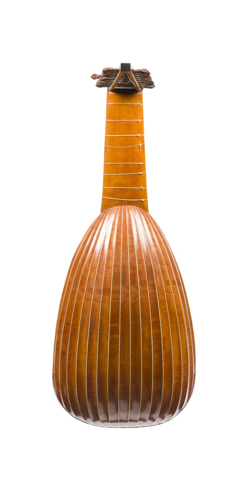 Laute aus Fichte und Ahorn, birnenförmig, Muschelkorpus, flache Decke mit handgeschnitzter Rosette, angesetzter Knickhals mit durchbrochenen Wirbelkasten, 10-chörig besaitet. L. 77 cm, B. 32, Halsmensur 28,5 cm. Lautenzettel: 'Jean Paul Kovalczyk en 1980 a Freiburg im Breisgau d'apres in Padova Michiell Harton'. Die Knickhalslaute ist ein traditionelles Saiteninstrument, das vor allem in der