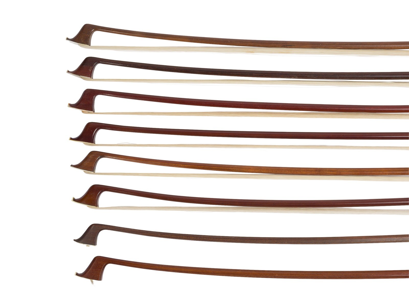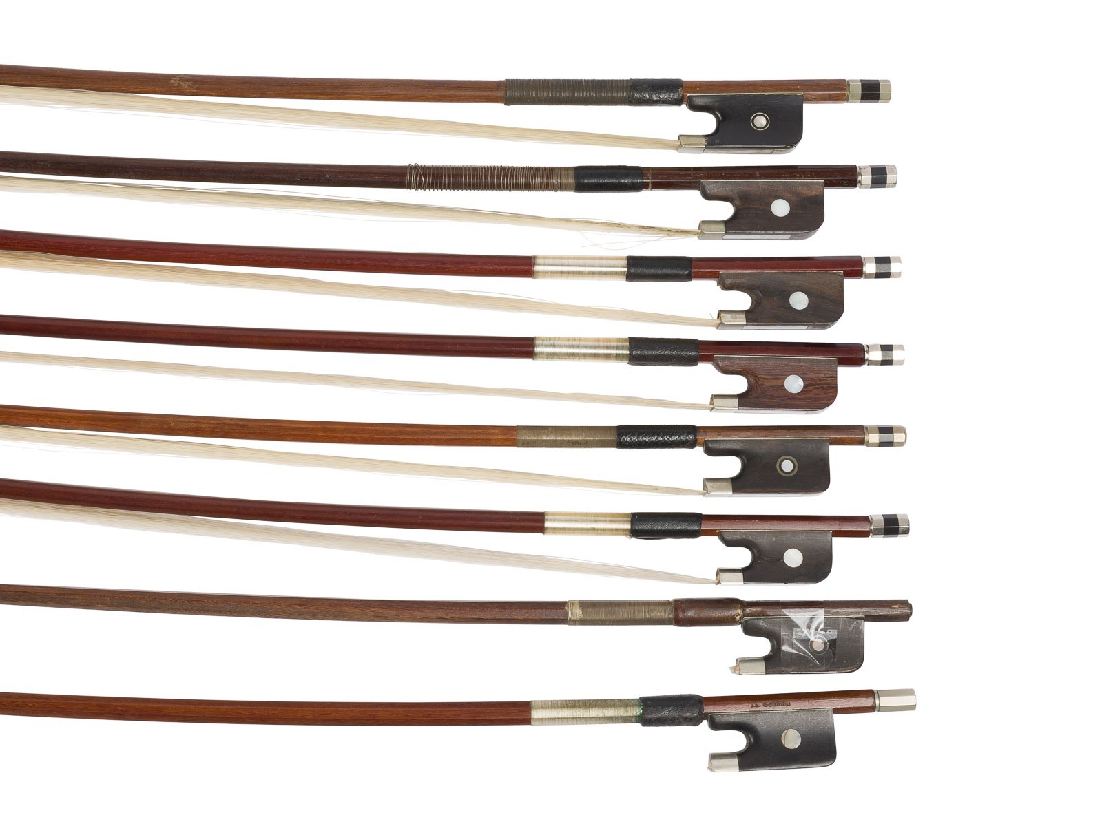 Runde und oktogonale Stange, Einfach- und Pariser Auge, Wicklung, Daumenleder, Knochen- und Kunststoffkopfplatte. L. 70 bis 72 cm, 1x 1/2 Bogen 61 cm. Ein Cellobogen gemarkt 'J.S. Gottfried'. Part. best. und besch.