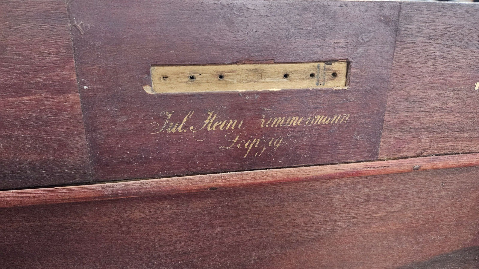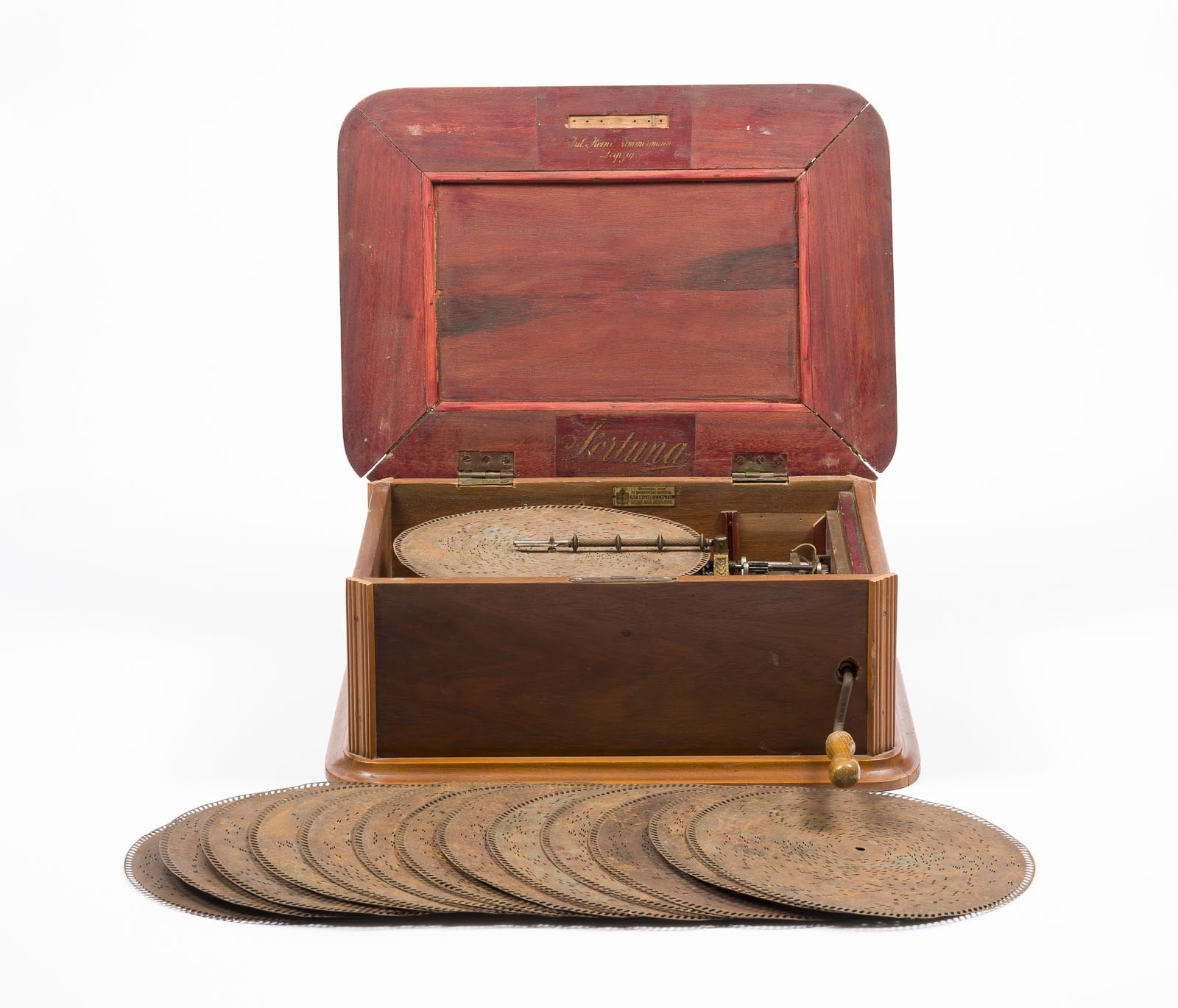 Furniertes Holzgehäuse mit Kamm-Spielwerk, mechanisches Lochplatten-Spielwerk mit Kurbelantrieb. H. 21, B. 50, T. 38 cm. Innen bezeichnet 'Jul. Heinr. Zimmermann Leipzig', 'Fortuna' und russisch bez.. 30 Metall-Lochplatten mit Märschen, Operetten- u. Tanzmusik, Volks- und Weihnachtsliedern. D. 28 cm.