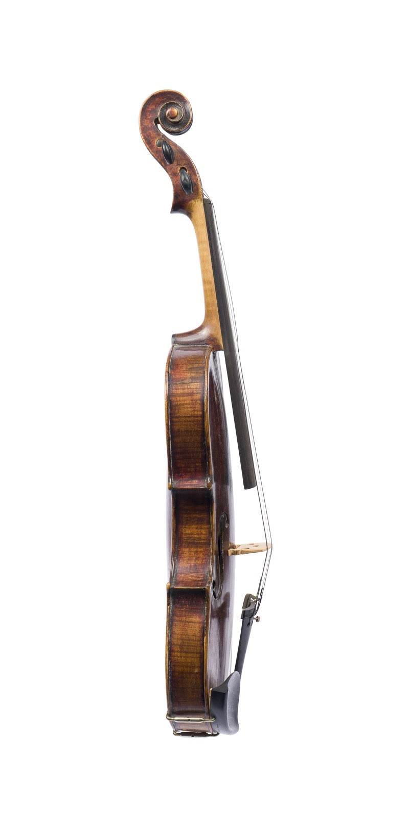 Einteilige Fichtenholzdecke und zweiteiliger Ahornboden, dunkelbrauner Lack. 4/4 Bratsche, L. 63,6, Korpusl. 38,2 cm. Ohne Zettel. Part. best. und besch., Decken- und Bodenrisse.