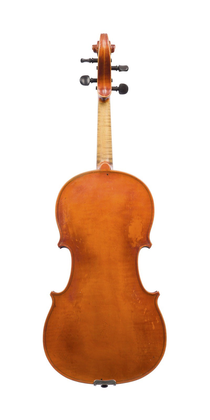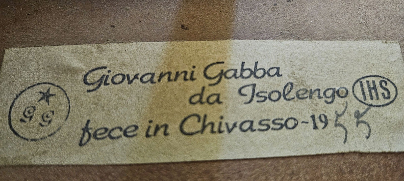 Zweiteilige Fichtenholzdecke und einteiliger Ahornboden, braun-rötlicher Lack. 4/4 Bratsche, L. 67,5, Korpusl. 40 cm. Bratschenzettel: 'Giovanni Gabba da Isolengo fece in Chivasso 1955 IHS'. Part. best. und ber.