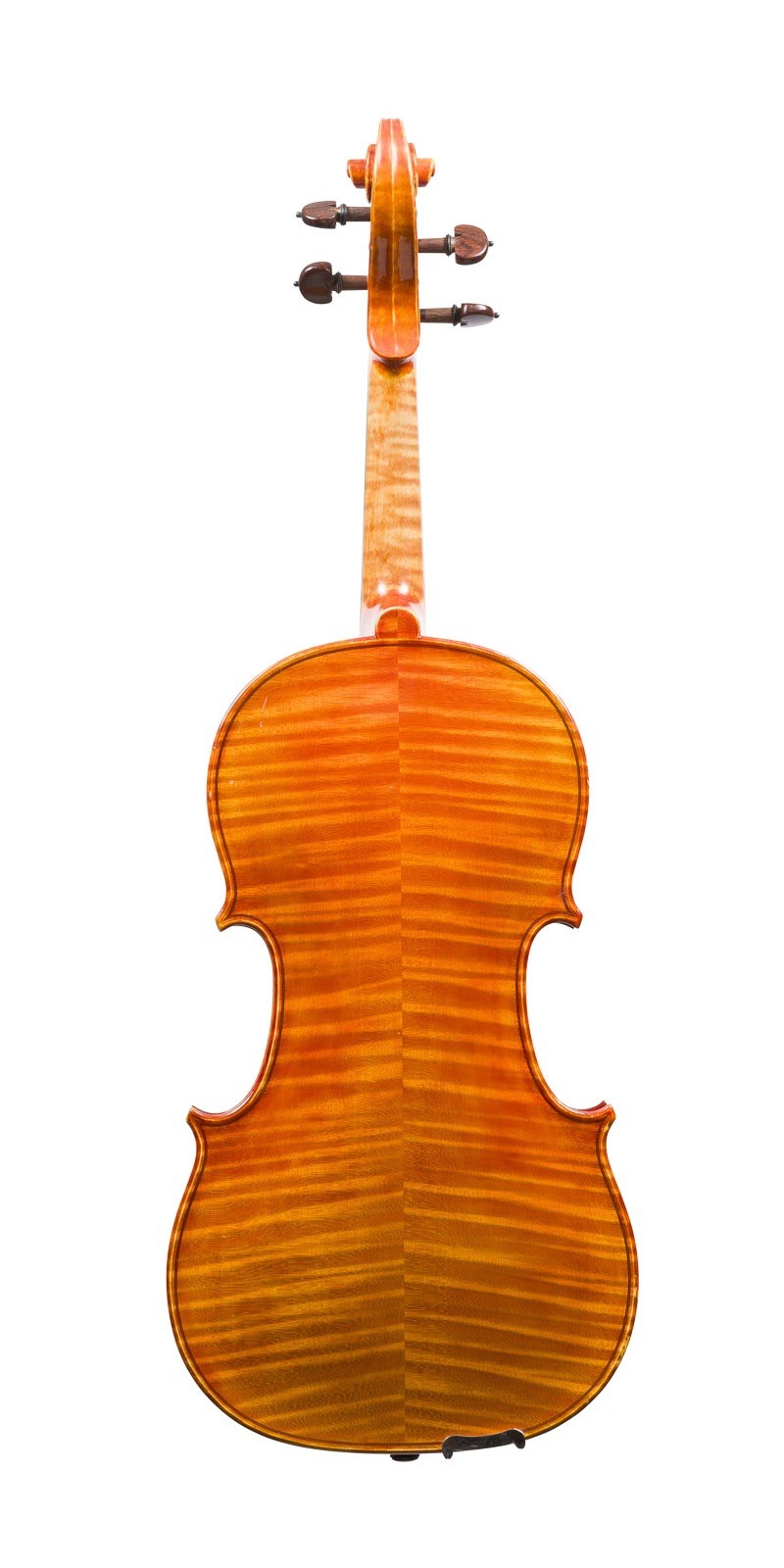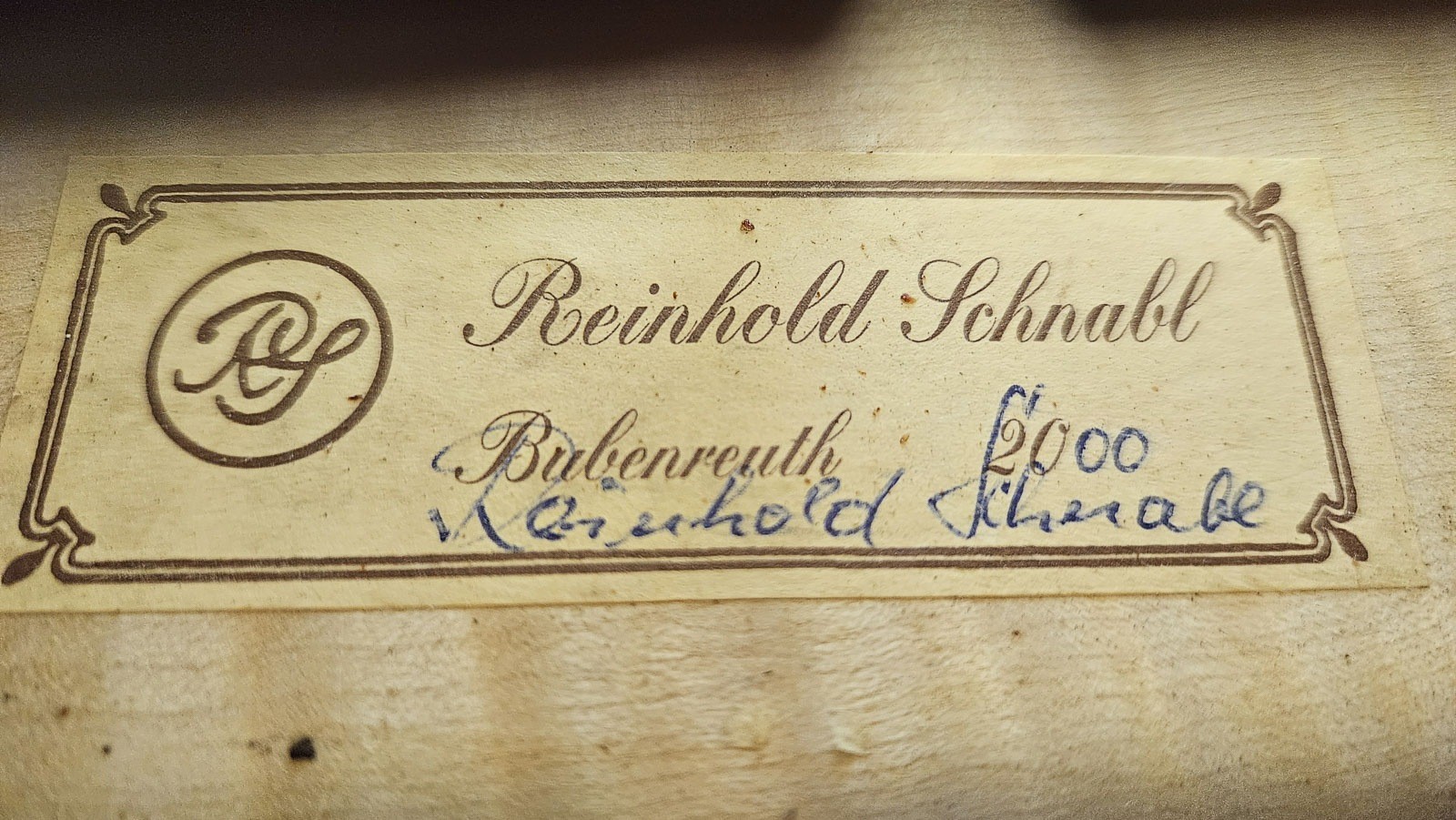 Zweiteilige Fichtenholzdecke und Ahornboden, hellbraun-rötlicher Lack. 4/4 Bratsche, L. 67,5, Korpusl. 41 cm. Bratschenzettel: 'Reinhold Schnabl Bubenreuth 2000' und handschriftlich signiert. Min. ber.