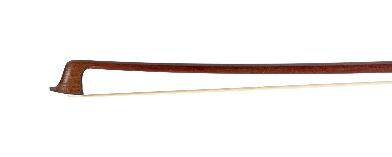 Runde Stange, Neusilbermontierung und -wicklung, Daumenleder, Einfach-Auge, Elfenbeinkopfplatte. L. 74,3 cm, Gew. ca. 66g. Bratschenbogen gemarkt 'Max Leicht'. Part. ber. und best., Daumenleder und Wicklung abgenutzt, Frosch min. besch.