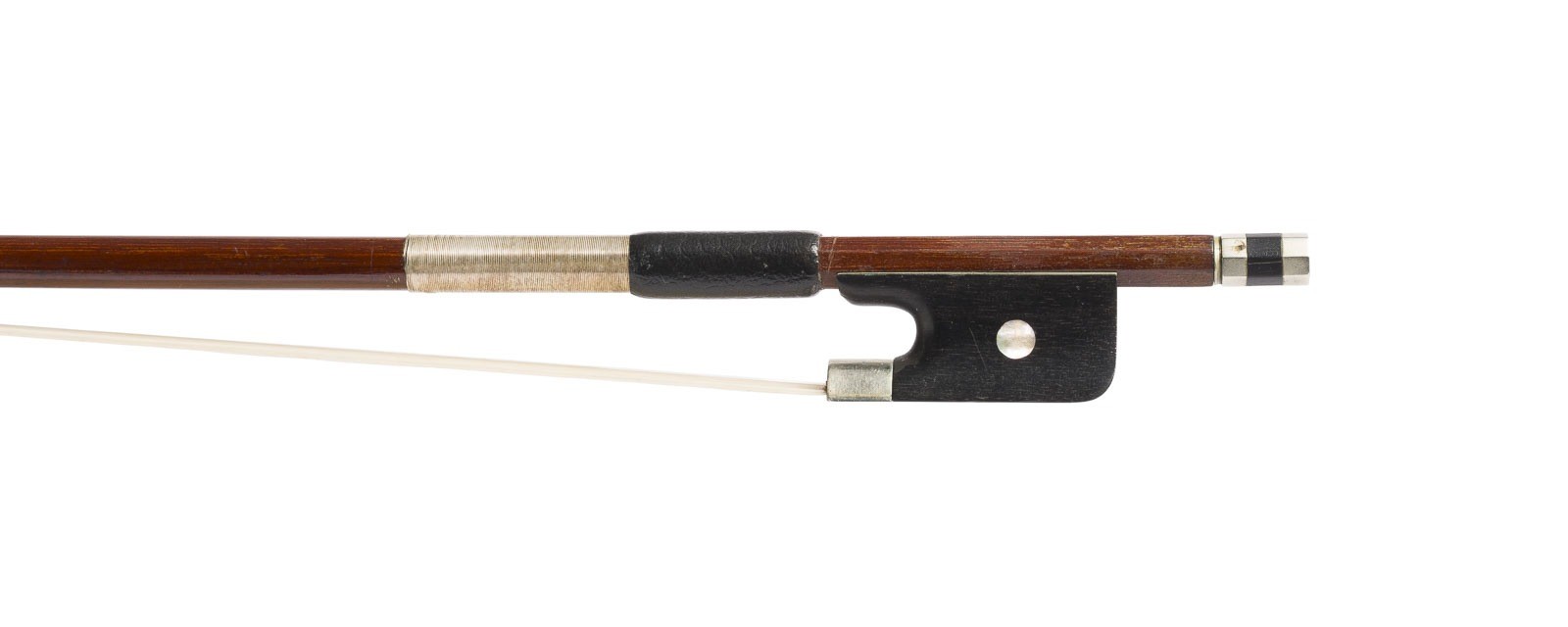 Runde Stange, Einfach-Auge, Neusilbermontierung und - wicklung, Daumenleder, Elfenbeinkopfplatte. L. 74,6 cm, Gew. ca. 70g. Geigenbogen ungemarkt. Min. best.