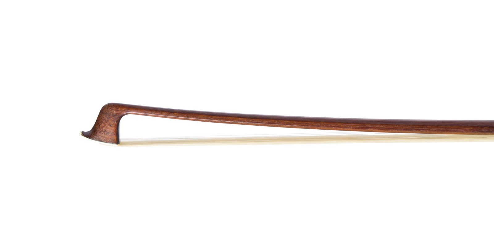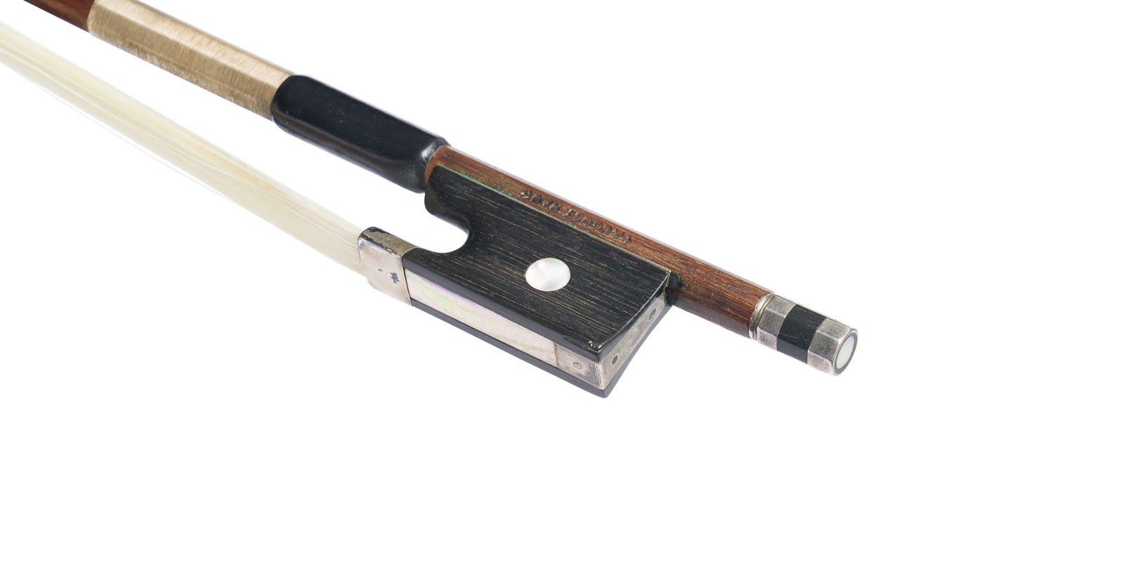 Oktogonale Stange, Einfach Auge, Silbermontierung, Wicklung, Daumenleder, Elfenbeinkopfplatte. L. 74,5 cm, Gew. ca. 58g. Geigenbogen gemarkt '*August Rau*'. Min. ber und best.