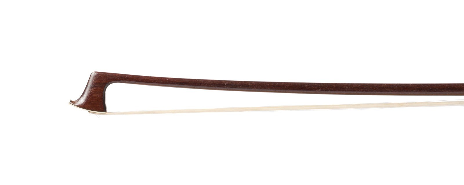 Runde Stange, Einfach-Auge, Neusilbermontierung, Elfenbeinkopfplatte. L. 73,6 cm, Gew. ca. 58g. Geigenbogen ungemarkt, vermutlich aus der Knopf-Familie. Min. ber.