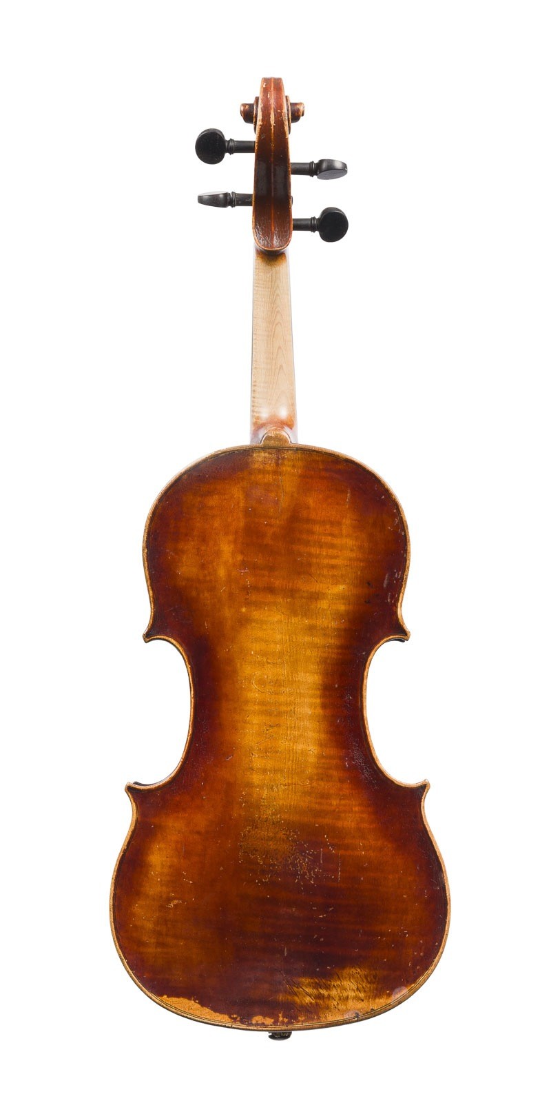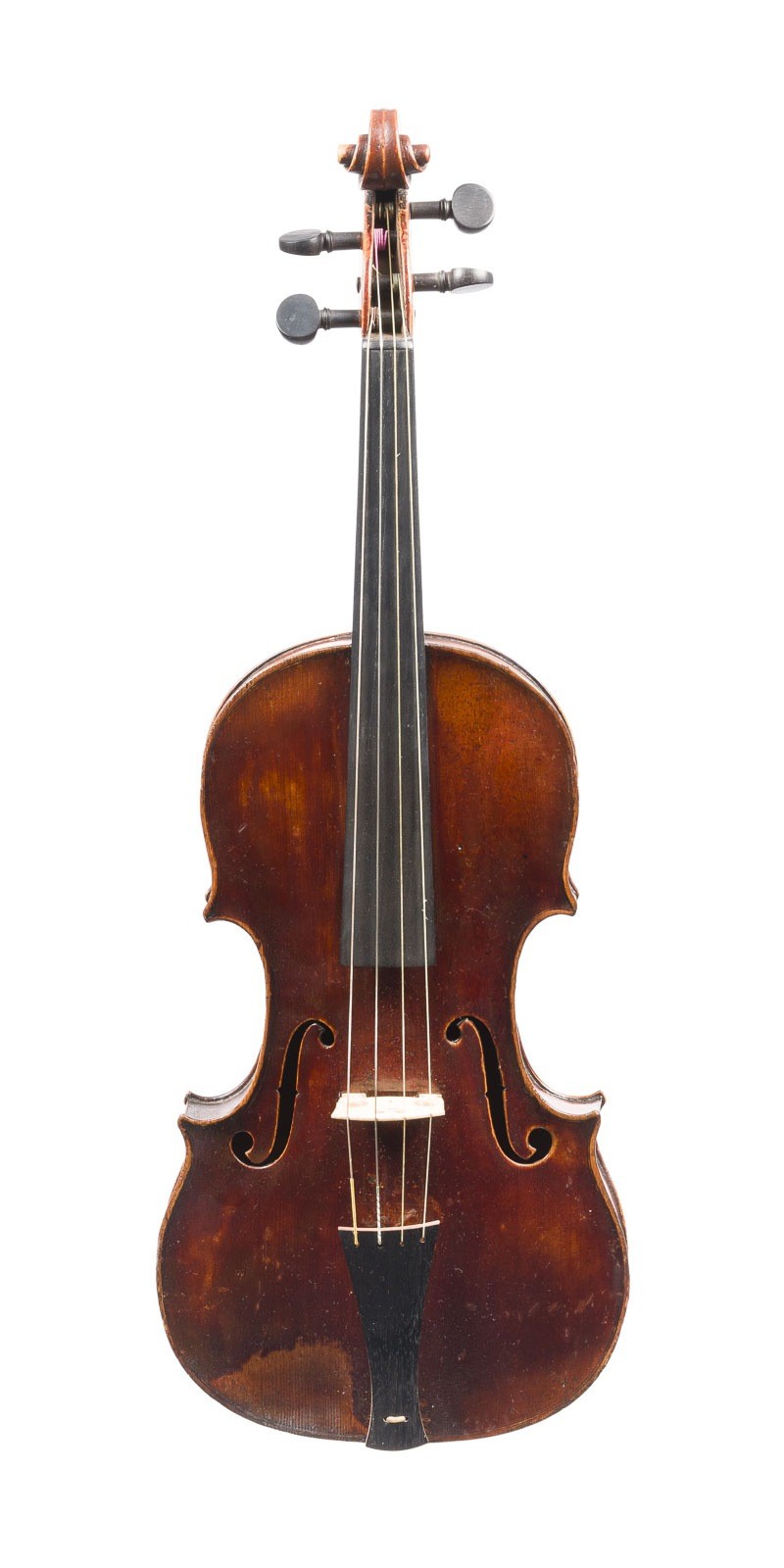 Einteilige Fichtenholzdecke und Ahornboden, braun-oranger Lack, original Hals. 4/4 Geige, L. 58,5 cm, Korpusl. 35,7 cm. Ungemarkt. Part. best. und ber., rest.