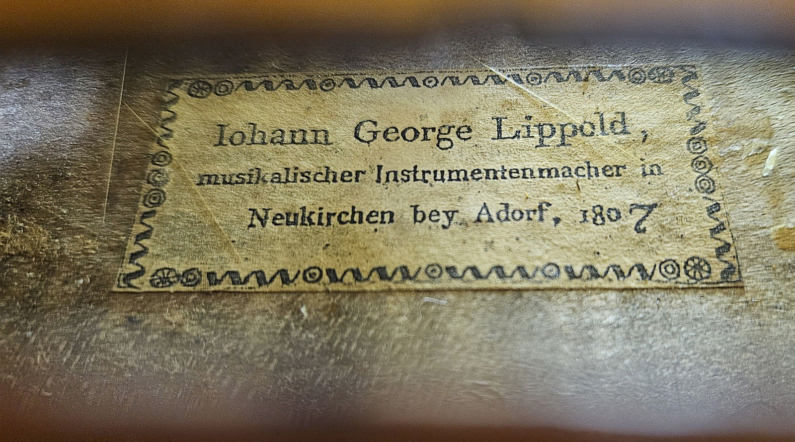 Zweiteilige Fichtenholzdecke und Ahornboden, oranger Lack. 4/4 Geige, L. 59,5 cm, Korpusl. 35,8 cm. Geigenzettel: 'Johann George Lippold musikalischer Instrumentenmacher in Neukirchen bey Adorf, 1807'. Min. best.