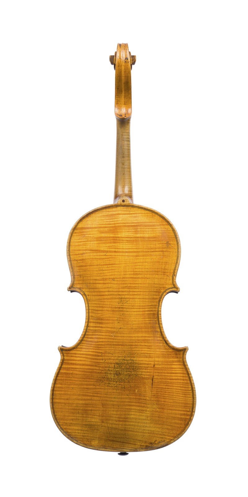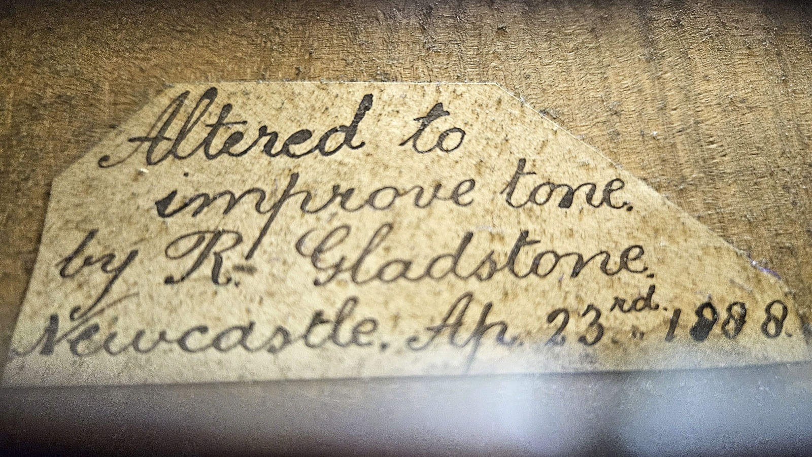 Einteilige Fichtenholzdecke und Ahornboden, braun-rötlicher Lack. 4/4 Geige, L. 59,2, Korpusl. 35,4 cm. Geigenzettel: 'Altered to improve tone by R. Gladstone Newcastle Ap. 23nd 1888'. Part. besch. und best., Deckenrisse, rest.