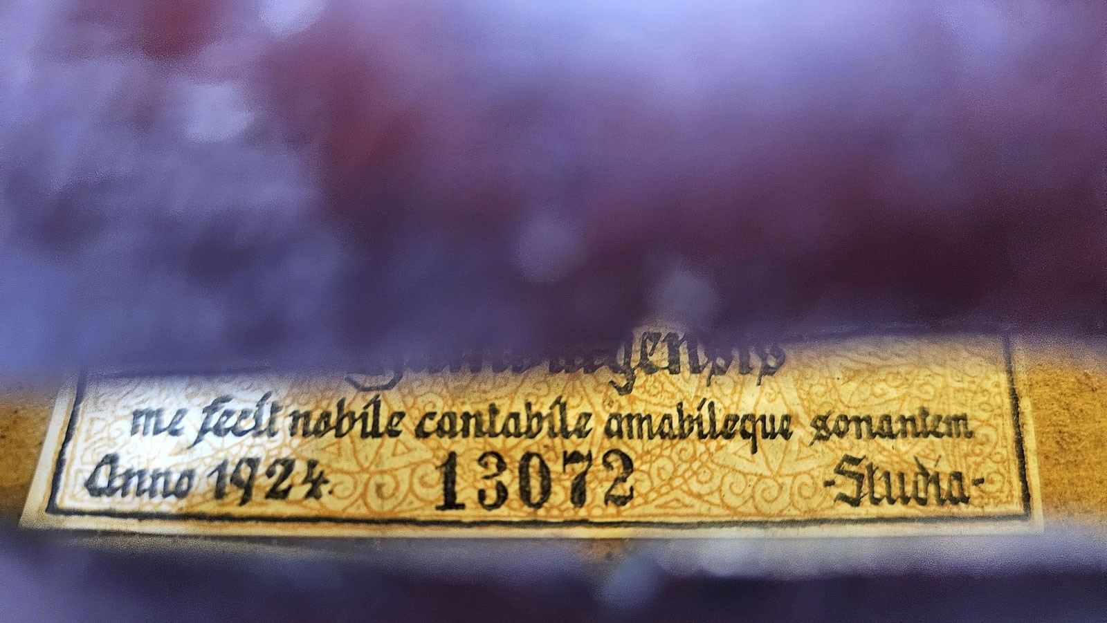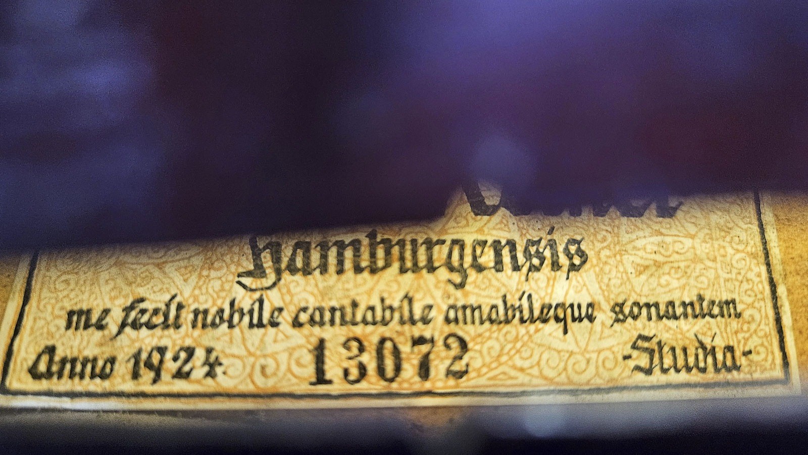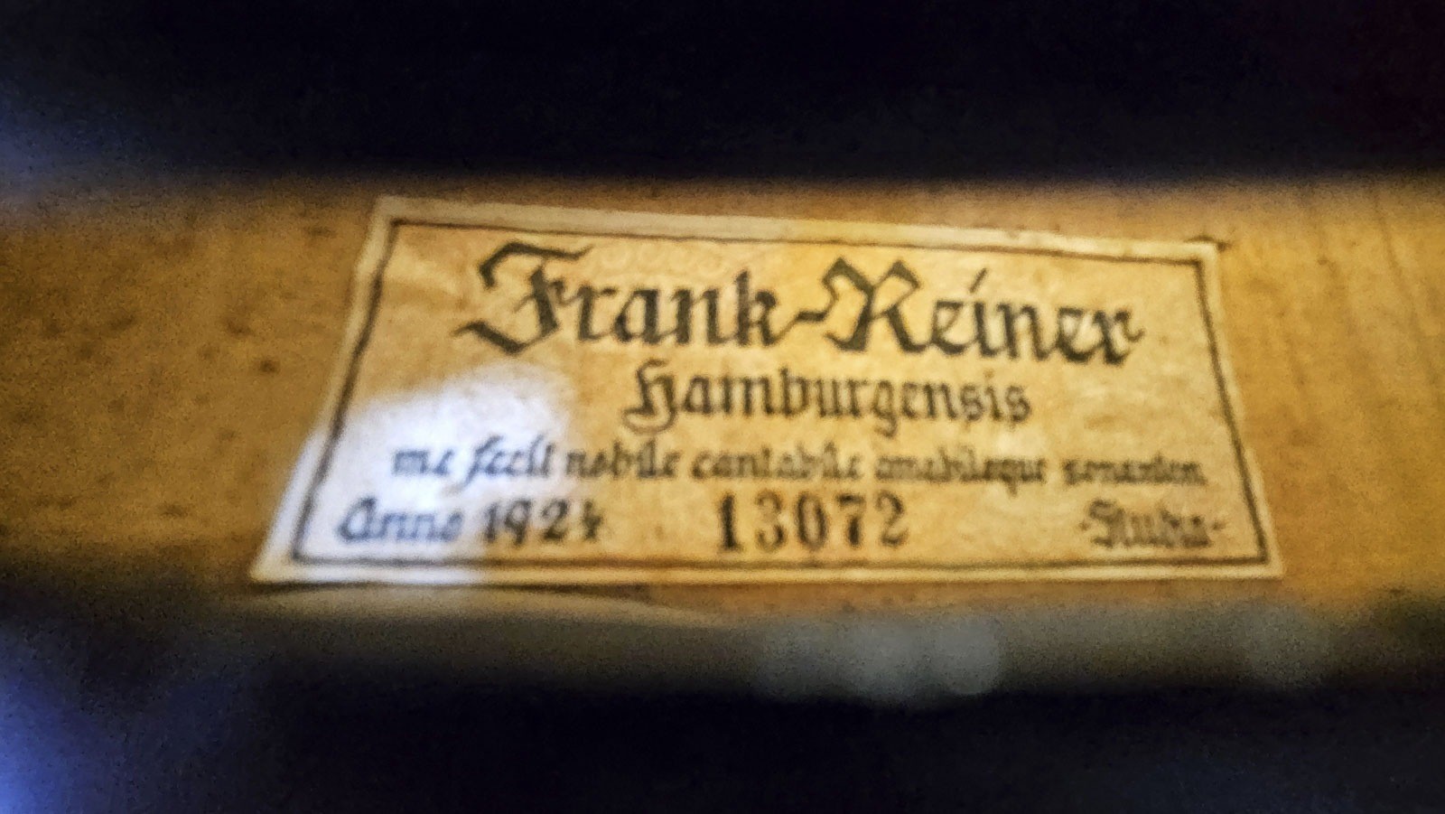 Zweiteilige Fichtenholzdecke und Ahornboden, dunkelrötlicher Lack, mit Koffer. 4/4 Geige, L. 58,8, Korpusl. 35,4 cm. Geigenzettel: 'Frank Reiner Hamburgensis me fecit nobile cantabile amabileque sontantem anno 1924 134072 Studia'. Part. best und ber., rest.