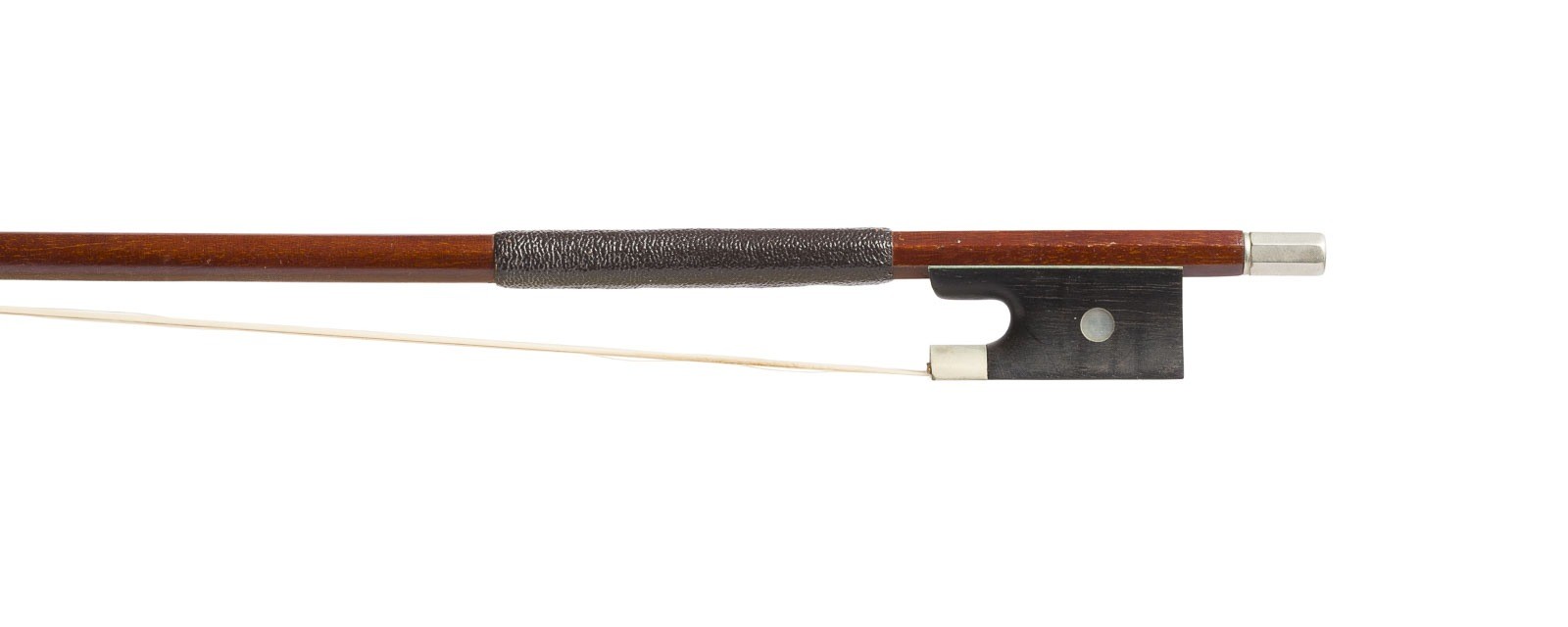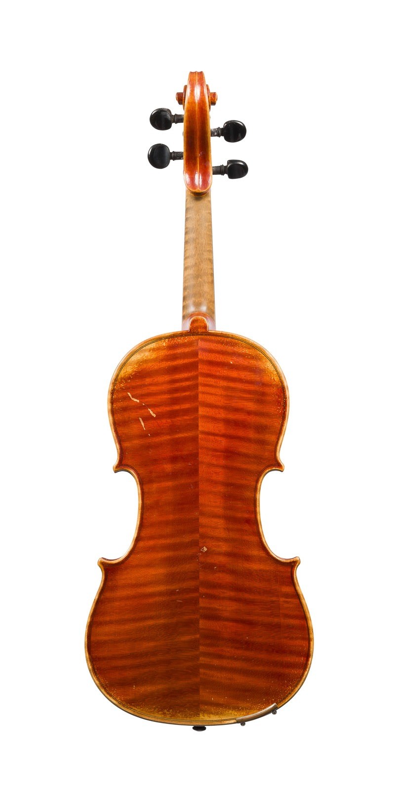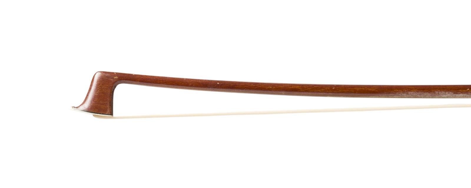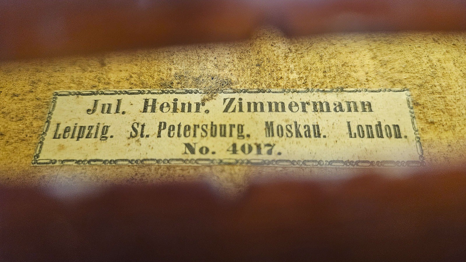 Zweiteilige Fichtenholzdecke und Ahornboden, hellbraun-oranger Lack, mit Koffer. 4/4 Geige, L. 58,5 cm, Korpusl. 35,5 cm. Geigenzettel: 'Jul. Heinr. Zimmermann Leipzig St. Petersburg Moskau London No. 4017'. 4/4 Geigenbogen, 20. Jh., runde Stange, Neusilbermontierung, Einfach-Auge, Daumenleder,