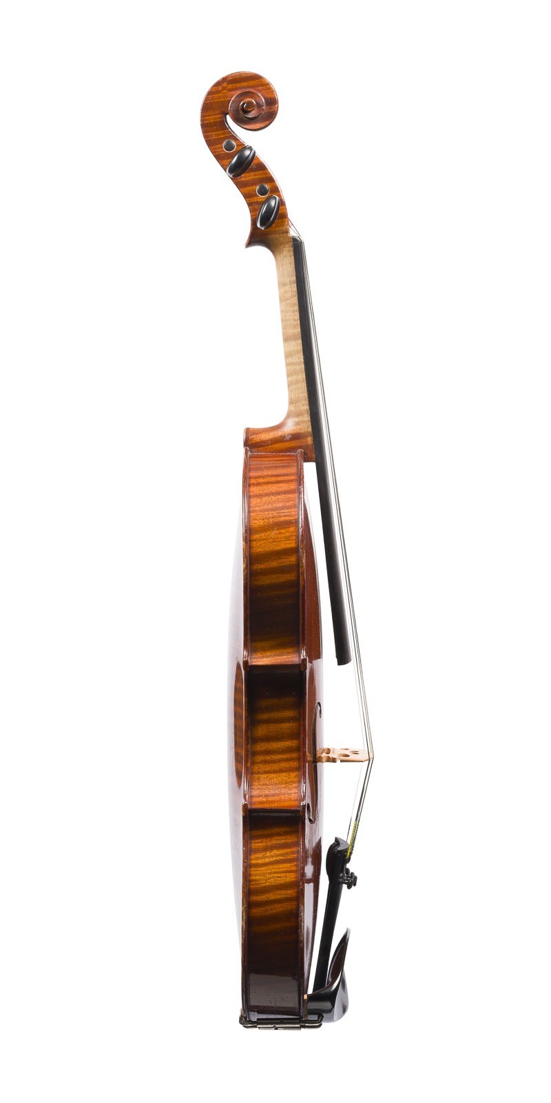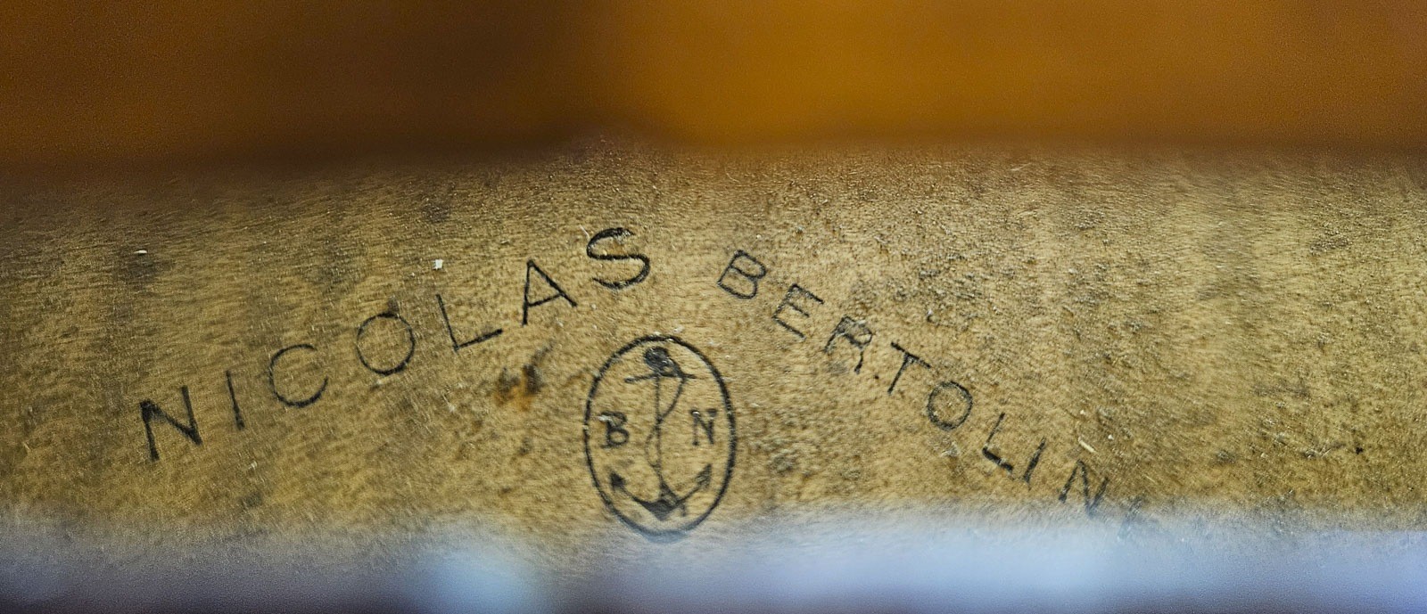 Zweiteilige Fichtenholzdecke und einteiliger Ahornboden, braun-oranger Lack. 4/4 Geige, L. 60 cm, Korpusl. 36,4 cm. Innen Brandstempel 'Nicolas Bertolini' und 'B N'. Part. best. und ber., rest.