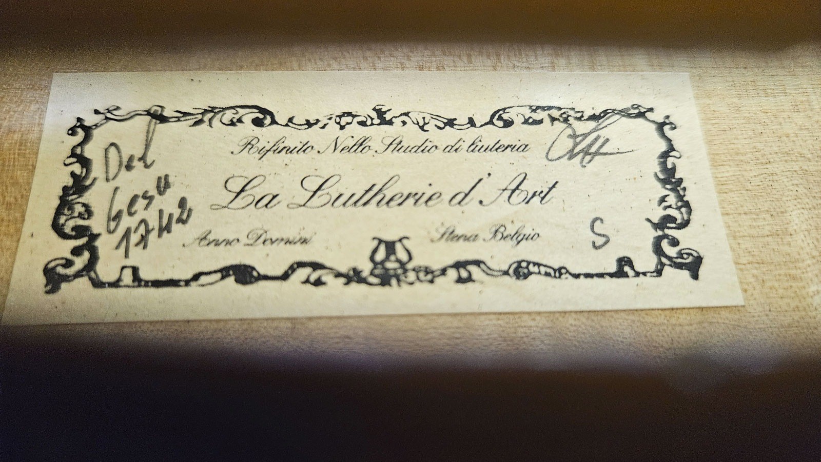 Zweiteilige Fichtenholzdecke und Ahornboden, braun-oranger Lack. 4/4 Geige, L. 58,8 cm, Korpusl. 35,5 cm. Geigenzettel: Riffinito Nello Studio di luteria, La Lutherie d'Art, Anno Domini, Belgie', handschriftlich 'Del Gesu 1742'. Min. ber.