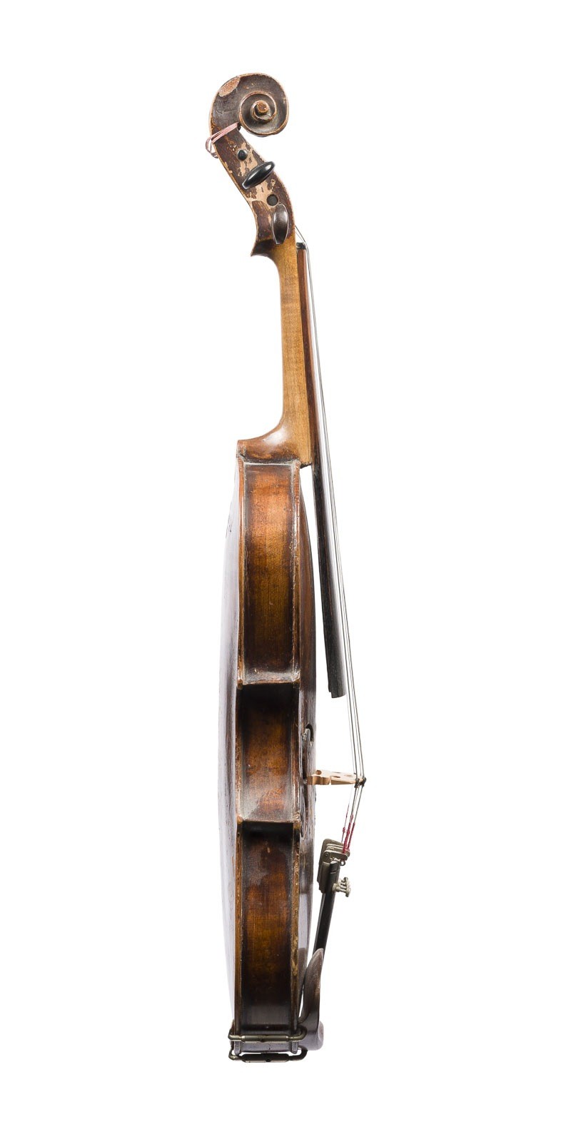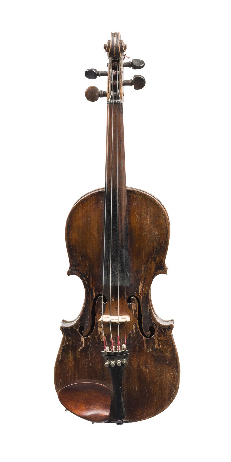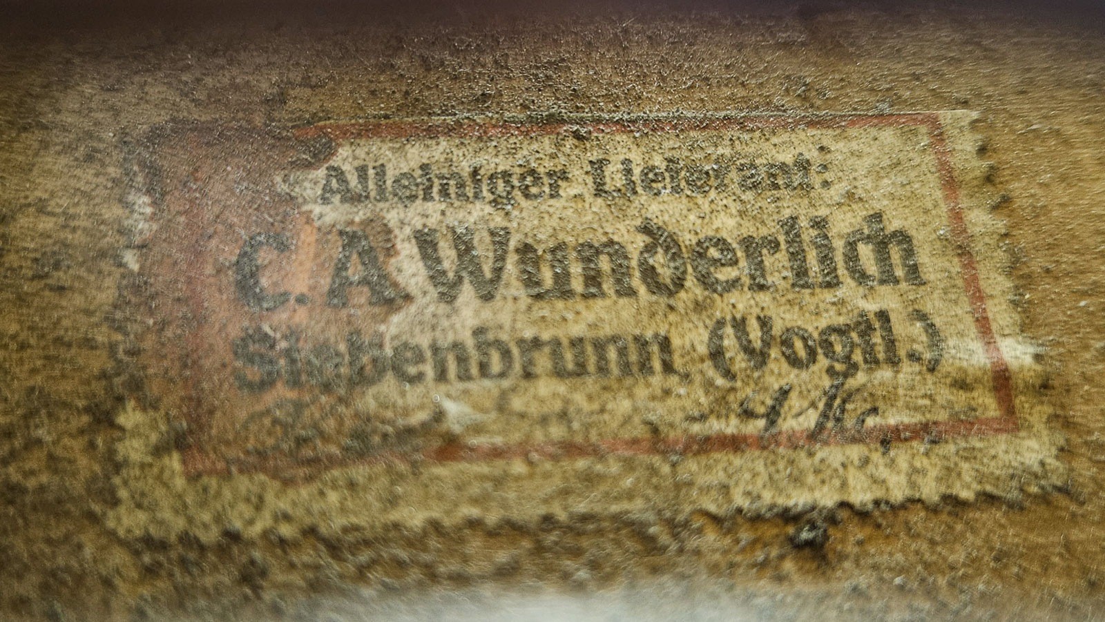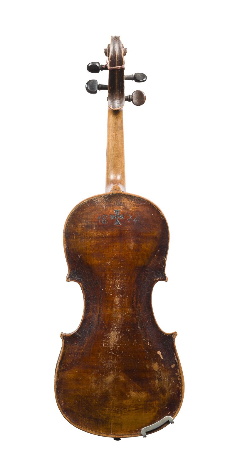 Einteilige Fichtenholzdecke und Ahornboden, dunkelbrauner Lack. 4/4 Geige, L. 59 cm, Korpusl. 36,1 cm. Geigenzettel: 'Alleiniger Lieferant C.A. Wunderlich Siebenbrunn (Vogtl.), Verso Brandstempel Kreuz und '1874'. Part. best. und besch., Lack mit Kraquelé und Abplatzungen.