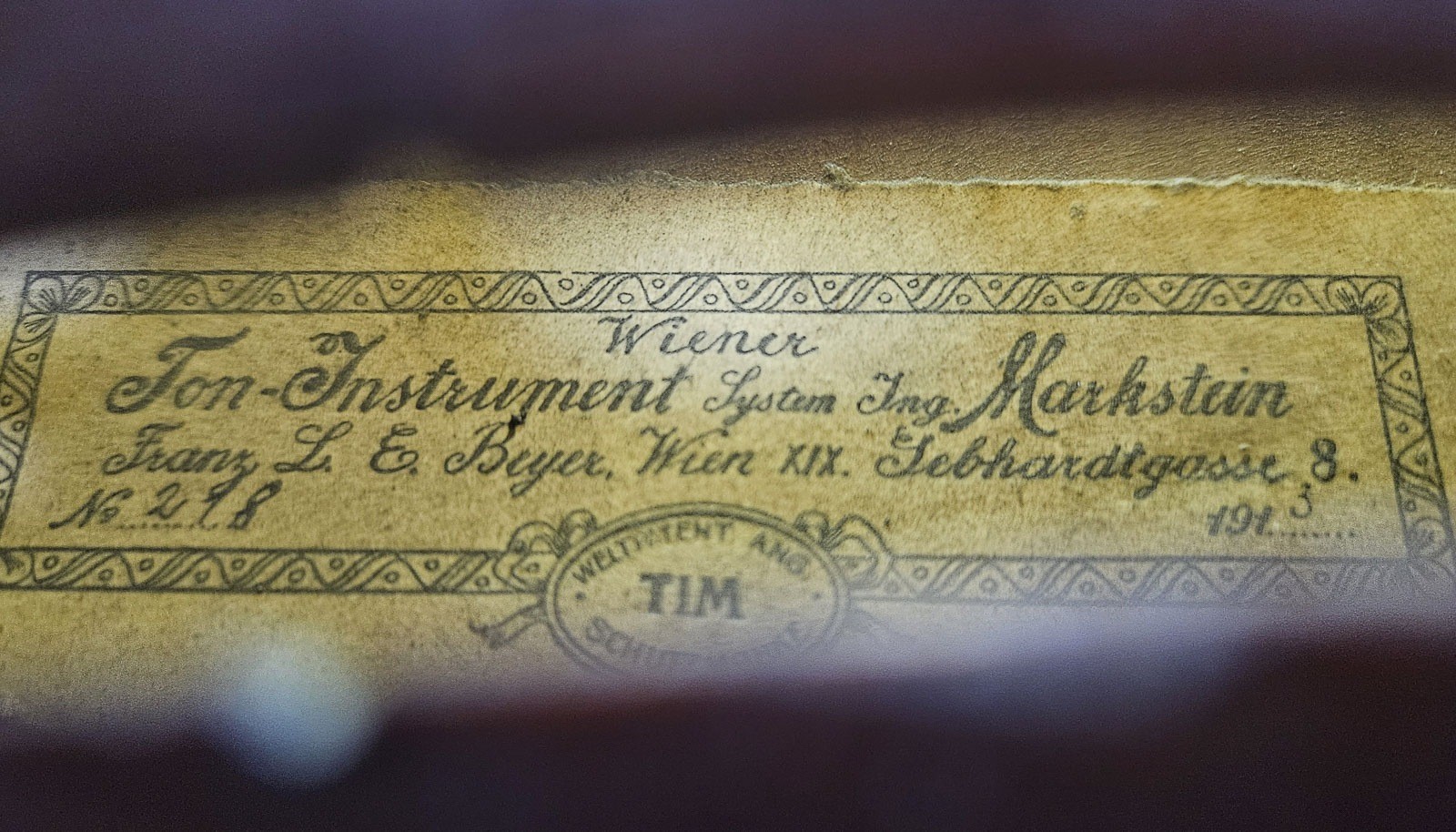 Zweiteilige Fichtenholzdecke und Ahornboden, brauner Lack. 4/4 Geige, L. 59, Korpusl. 35,6 cm. Geigenzettel: 'Ton Instrument Wiener System Ing. Markstein Franz L E Beyer Wien XIX Liebgartgasse 8 , No. 298, 1913', 'Schutzmarke Tim', rückseitig gemarkt 'TIM'. Part. best. und ber, ohne Steg.