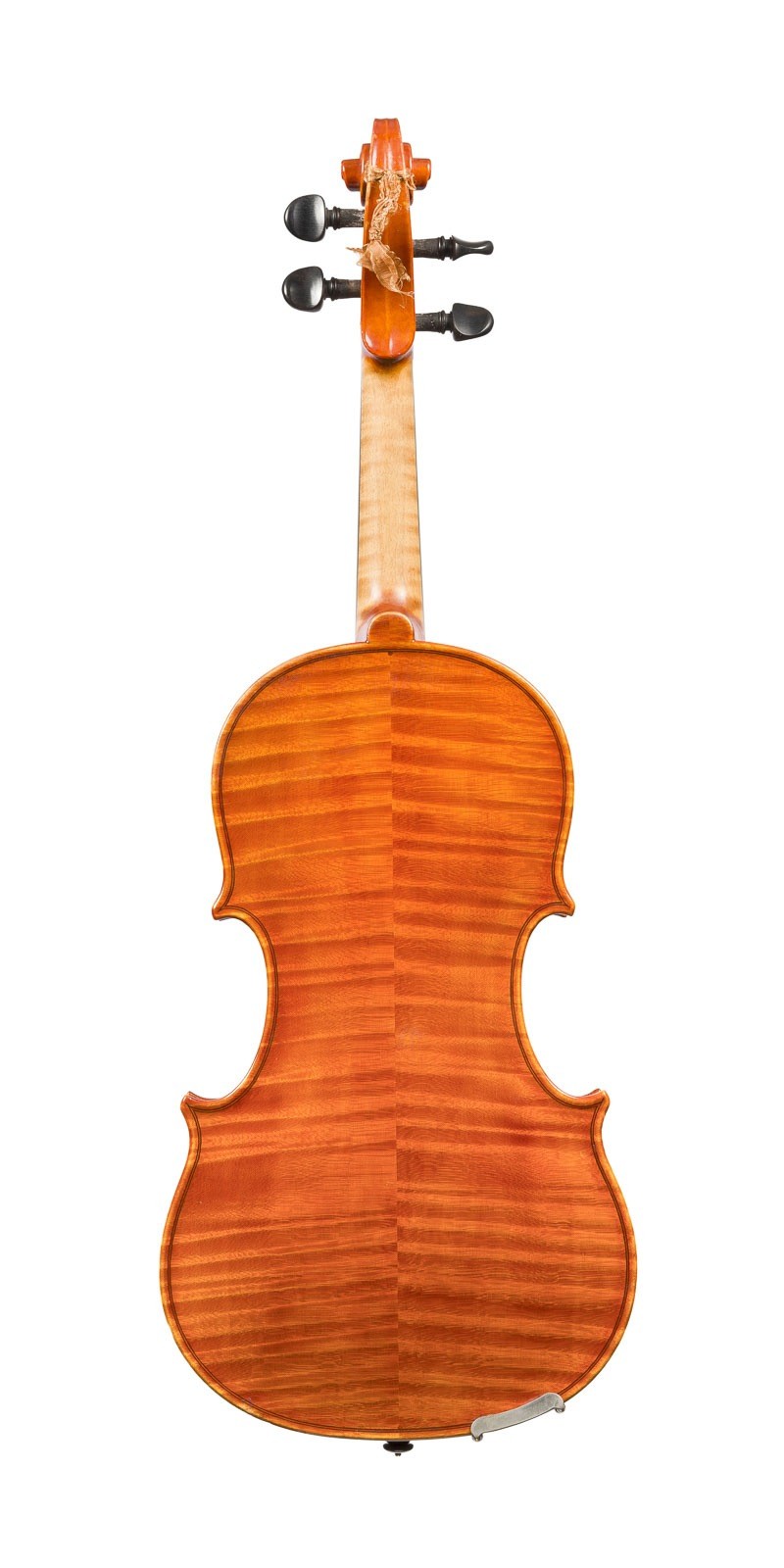 Zweiteilige Fichtenholzdecke und Ahornboden, hellbraun-oranger Lack, mit Koffer. 4/4 Geige, L. 58,5 cm, Korpusl. 35,5 cm. Mit Saiten, Wirbel, Wolfstöter. 4/4 Geigenbogen, Deutsch, 20. Jh., oktogonale Stange,