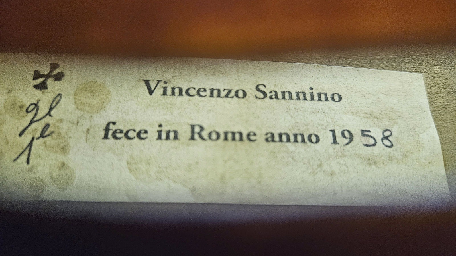 Einteilige Fichtenholzdecke und Ahornboden, hellbrauner Lack. 4/4 Geige, L. 58,2 Korpusl. 35,1 cm. Geigenzettel: 'Vincenzo Sannino fece in Rome anno 1958', Kreuz und 'gl 1e'. Vincenzo Sannino zählt zu den bedeutenden Vertretern des neapolitanischen Geigenbaus des