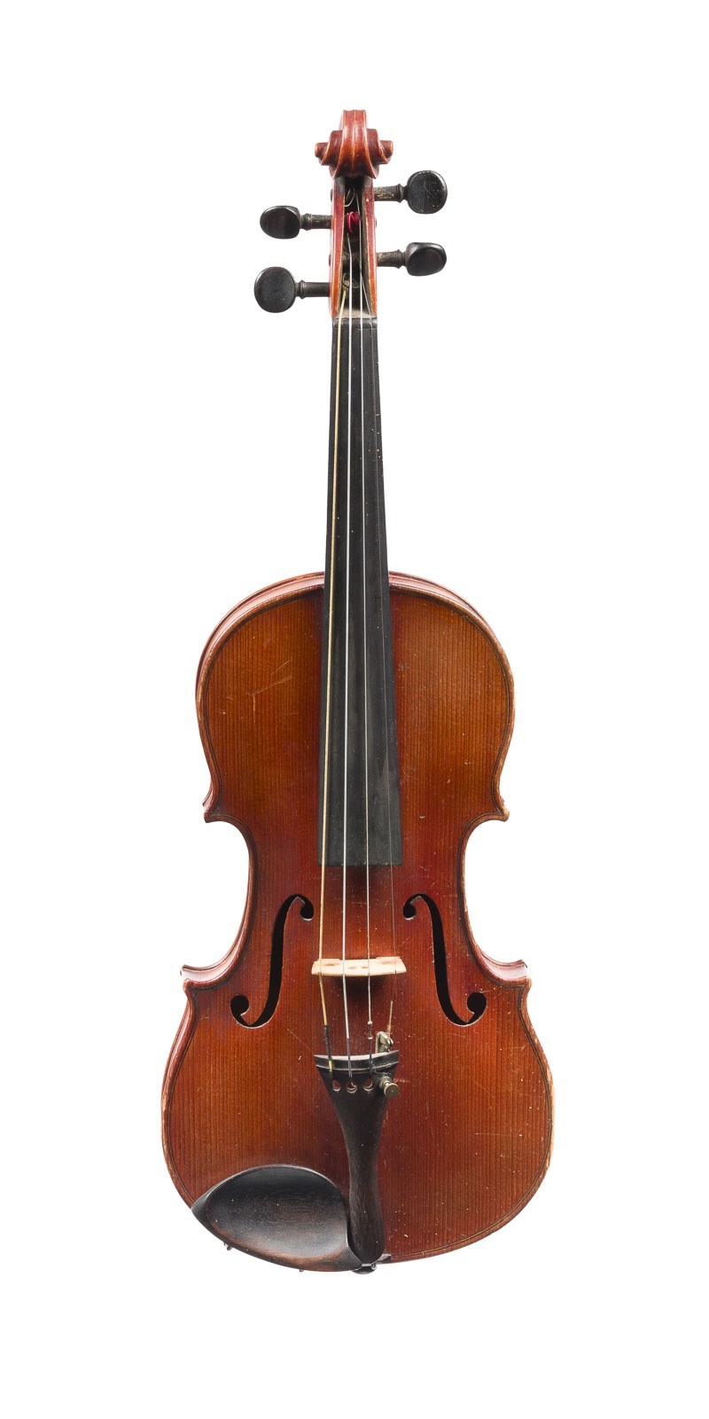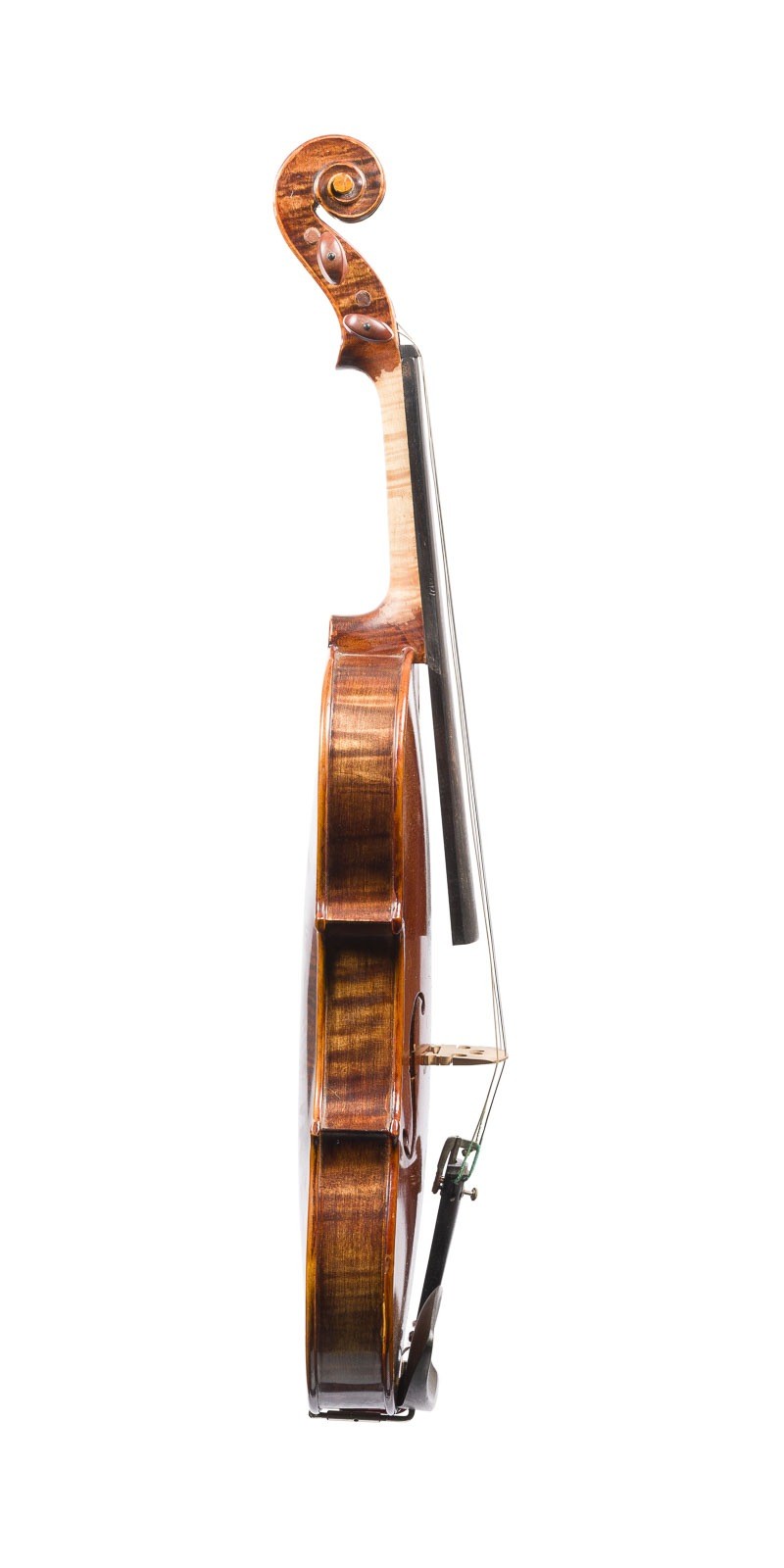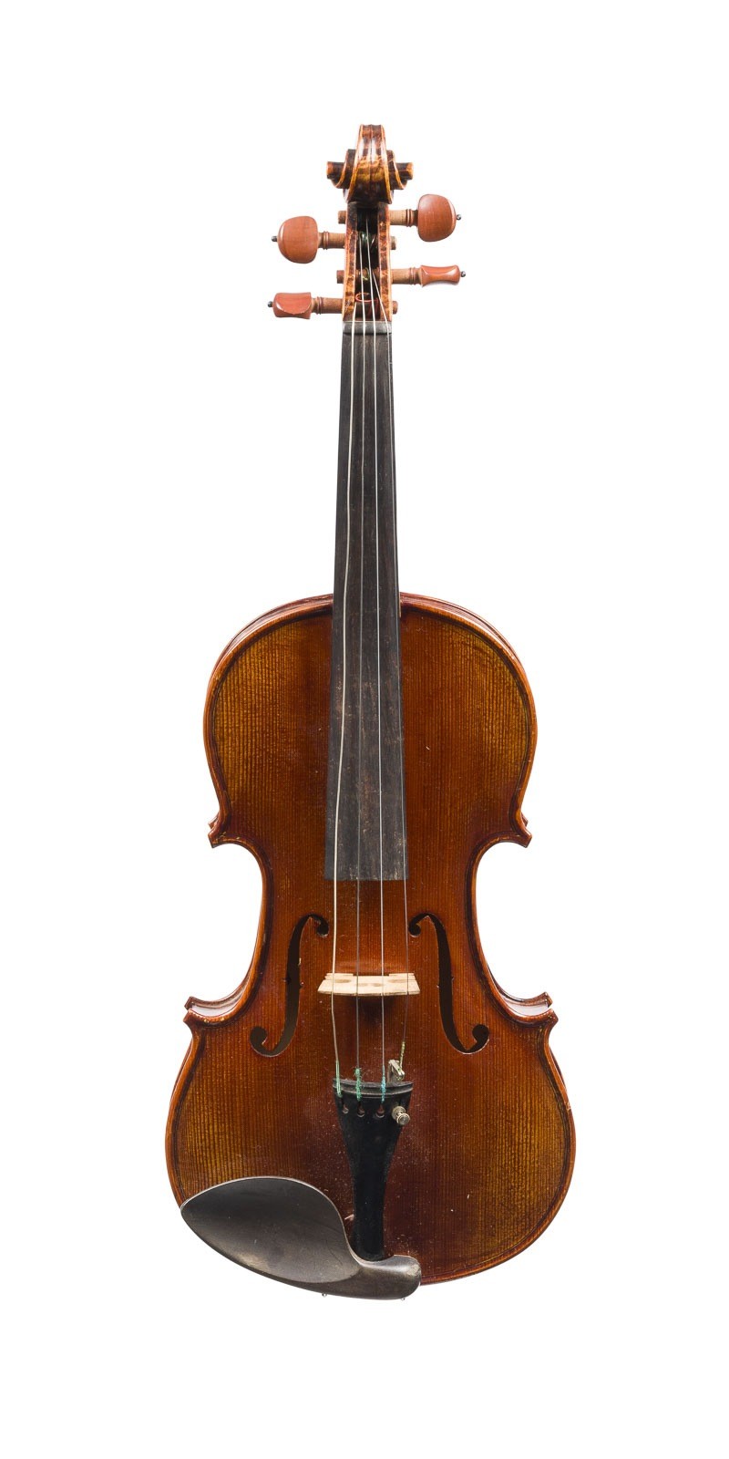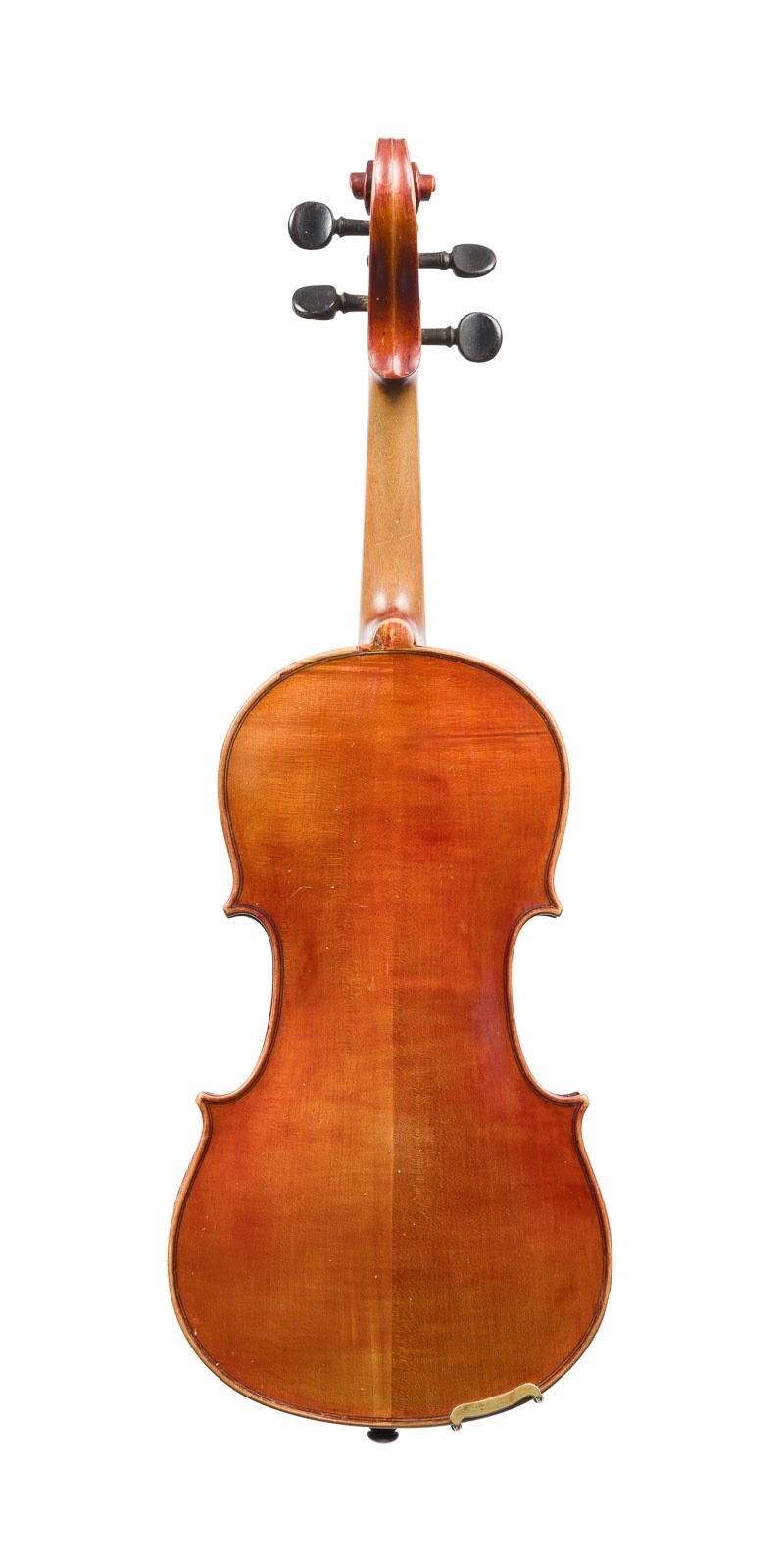 Zweiteilige Fichtenholzdecke und Ahornboden, brauner Lack. 3/4 Geige, L. 54,5/55,1, Korpusl. 32,6/33,3 cm. Min. best.