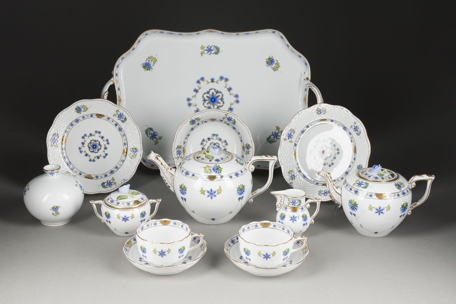Porzellan, polychrome Malerei, Goldstaffage. L. 46 cm (Tablett), H. 11,5-13,5 cm (Teekanne). Aufglasurblauer Manufakturstempel, Dekorzeichen, part. Blindstempel, teilw. Malersignatur, Modellnr.,. Bestehend aus: 1 Tablett, 1 Vase, 2 Teekannen, 1 Zuckerdose, 1 Milchkännchen, 1 Schale, 2