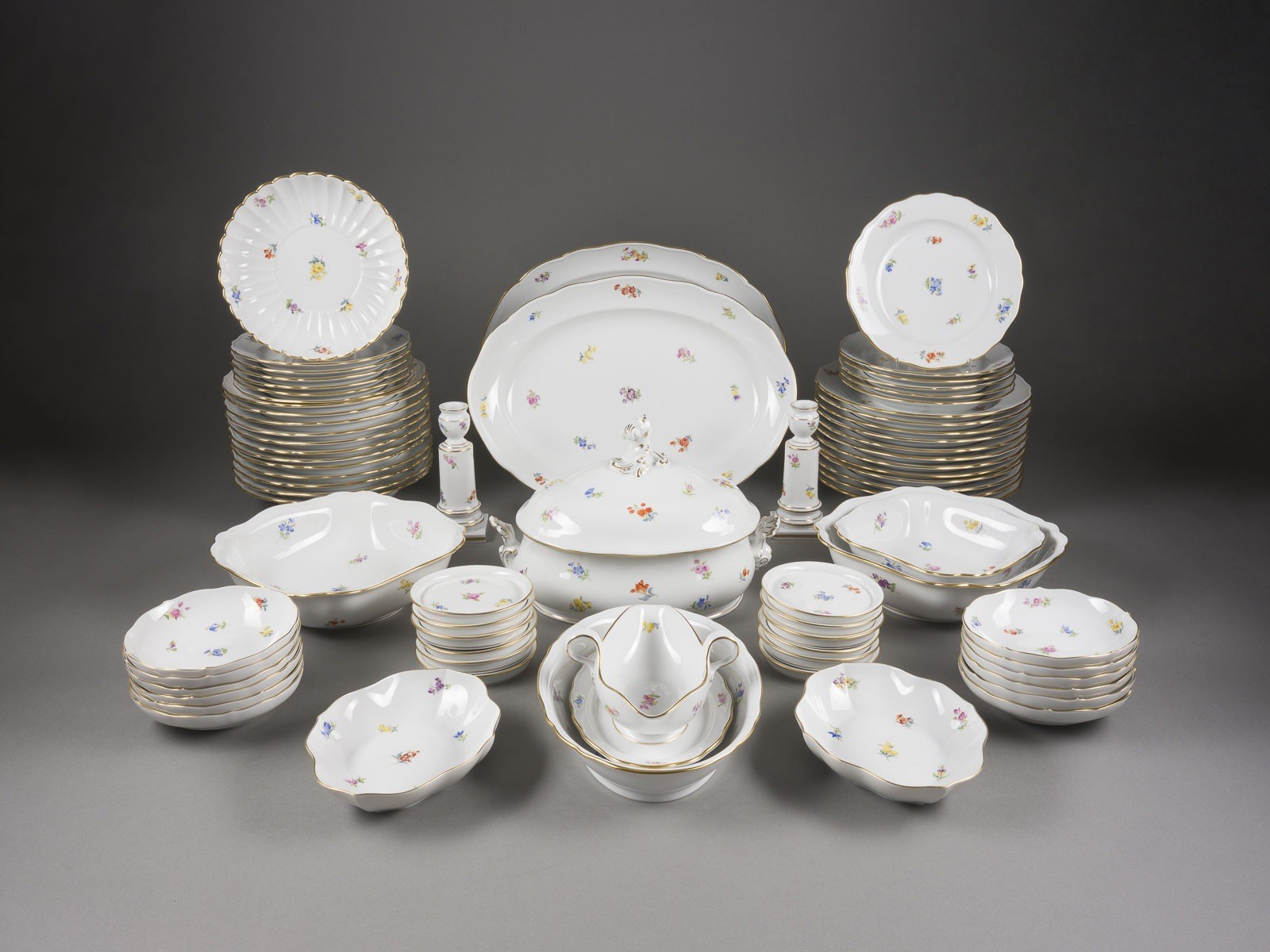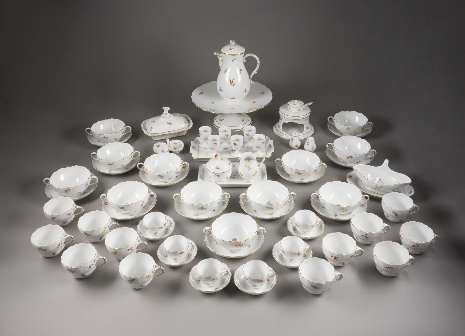 Porzellan, polychrome Malerei, Goldstaffage. D. 24,5 cm (Speiseteller), D. 11 cm (Untersetzer). Unterglasurblaue Schwertermarke, Press- und Malernummer, Modellnr., part. Jahreszeichen. Bestehend aus: 12 Kaffeetassen mit 12 Untertassen, 6 Mokkatassen mit 6 Untertassen, 1