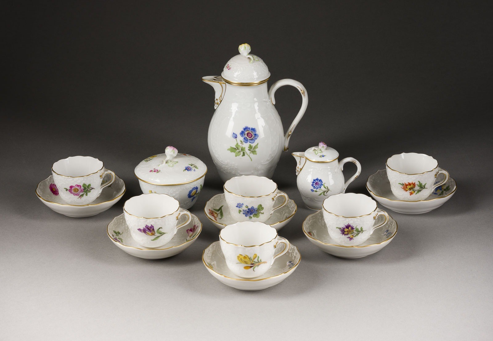 Porzellan, polychrome Malerei, Goldstaffage. H. 20 cm (Mokkakanne). Unterglasurblaue Schwertermarke, Press- und Malernummer, Modellnr. Form: Neumarseile. Bestehend aus: 1 Mokkakanne, 1 Milchkännchen mit Deckel, 1 Zuckerdose