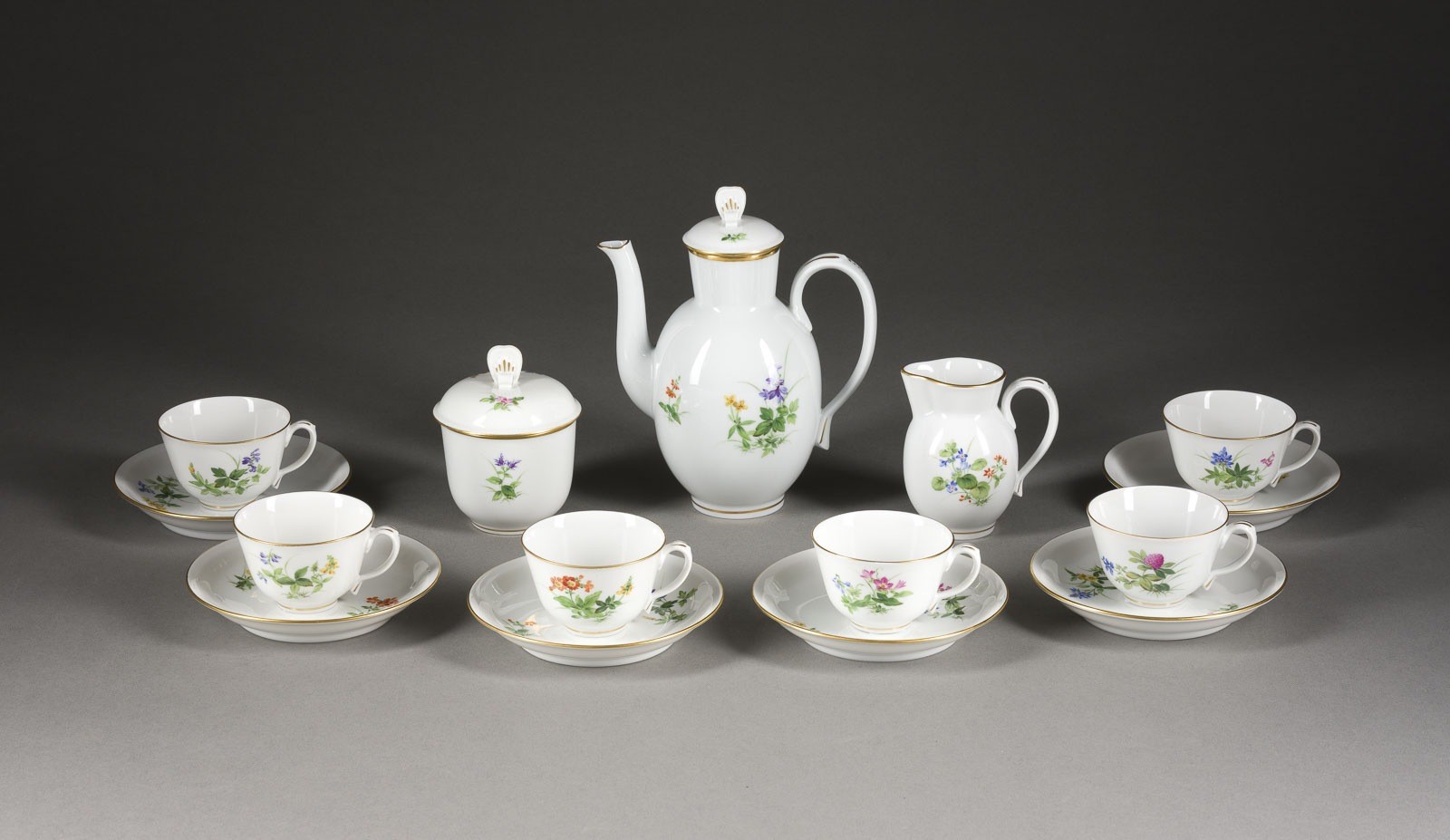 Porzellan, polychrome Malerei, Goldrand. H. 18,5 cm (Kanne). Unterglasurblaue Schwertermarke, Press- und Malernummer, part. Modellnr. Bestehend aus: 1 Mokkakanne, 1 Milchkännchen, 1 Zuckerdose mit Deckel, 6 Mokkatassen mit 6