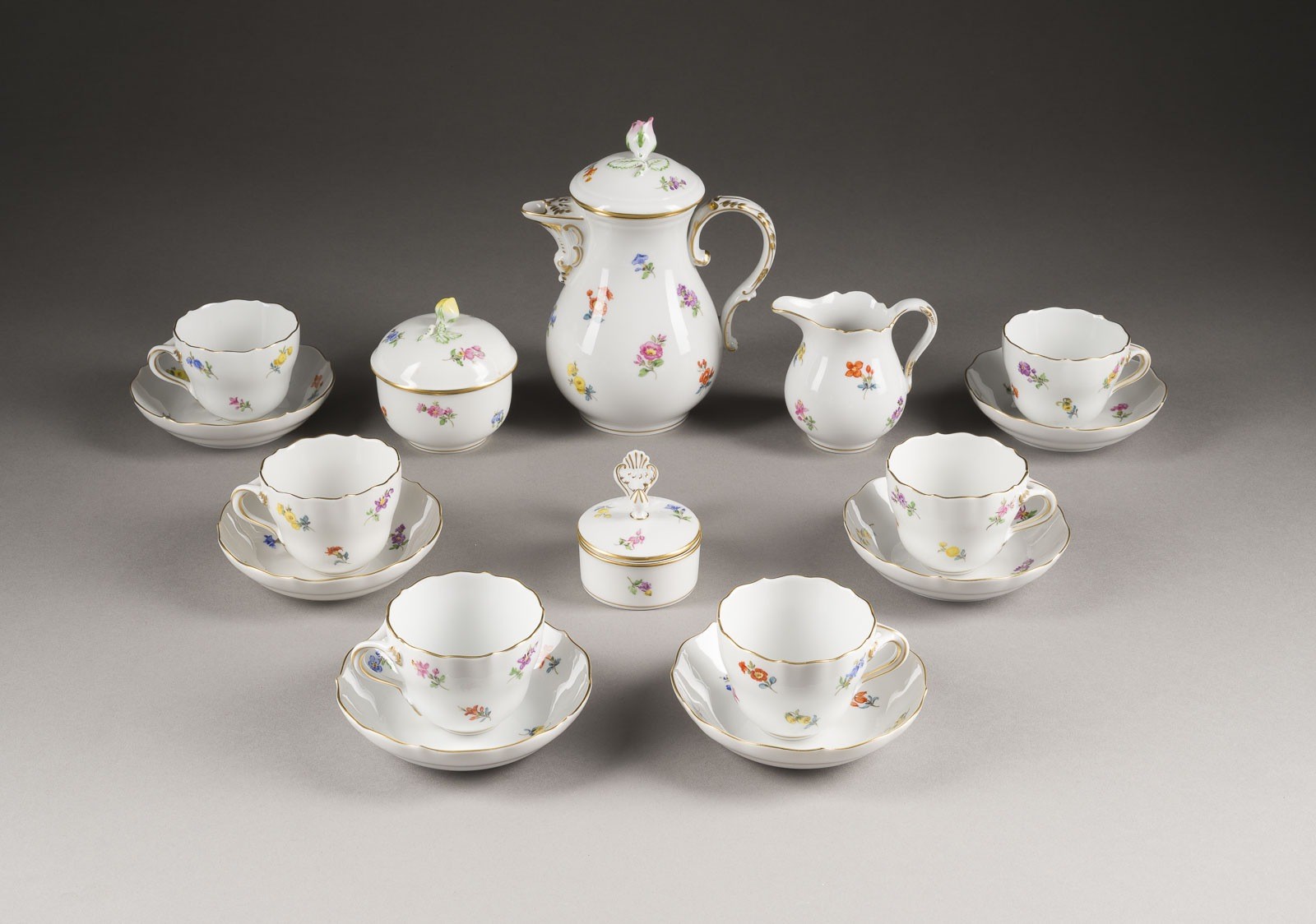 Porzellan, polychrome Malerei, Goldstaffage. H. 16,8 cm (Mokkakanne). Unterglasurblaue Schwertermarke, Press- und Malernummer, Jahreszeichen, Modellnr. Form: Neuer Ausschnitt. Bestehend aus: 1 Mokkakanne, 1 Milchkännchen, 1 Zuckerdose, 6
