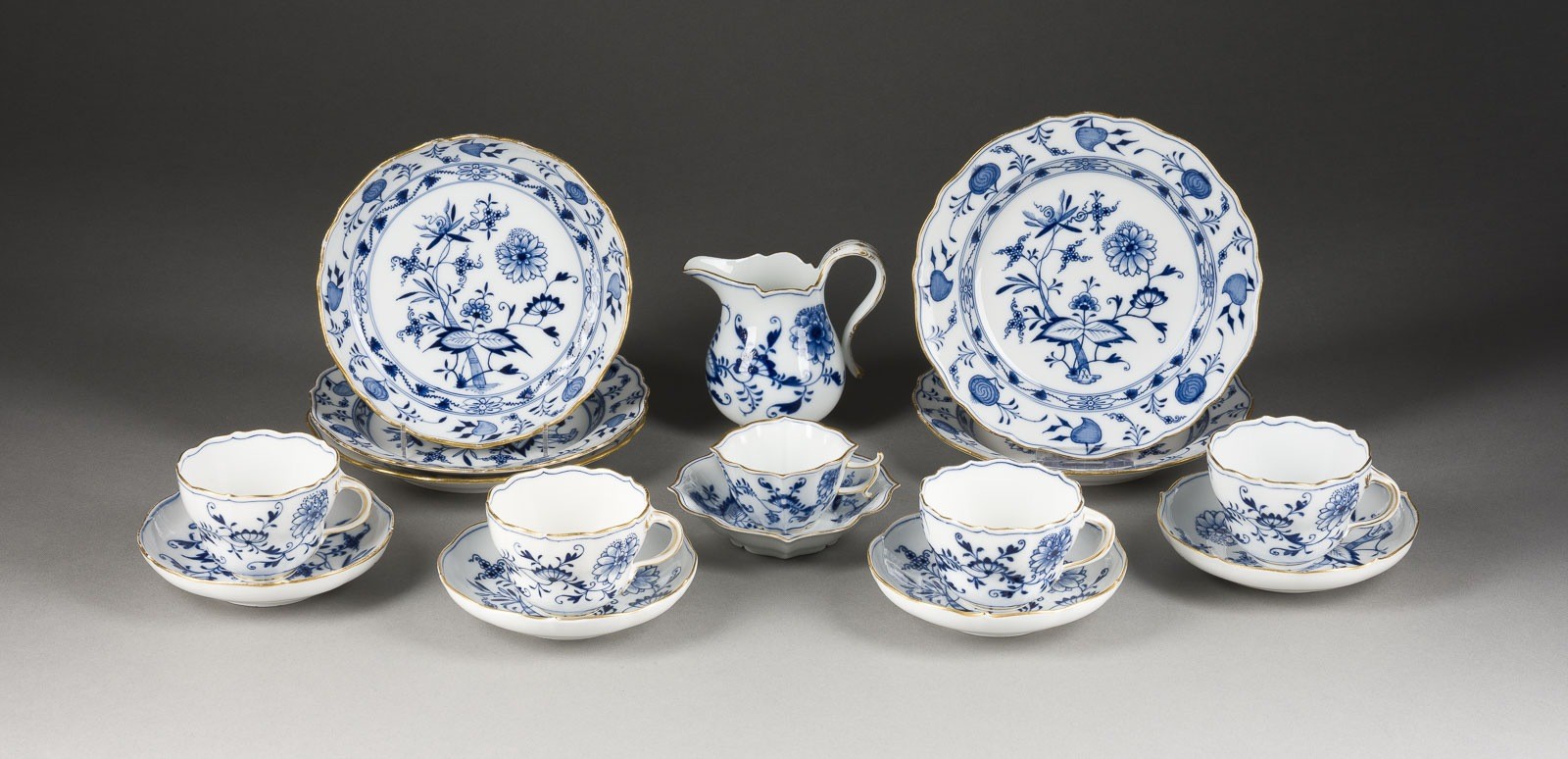 Porzellan, Blaumalerei, Goldrand. H. 11,3 cm (Milchkännchen). Unterglasurblaue Schwertermarke (Knaufschwerter), part. Press- und Malernummer, part. Jahreszeichen, Modellnr. Bestehend aus: 1 Mokkatasse mit 1 Untertasse, 4 Kaffeetassen mit 4 Untertassen, 4