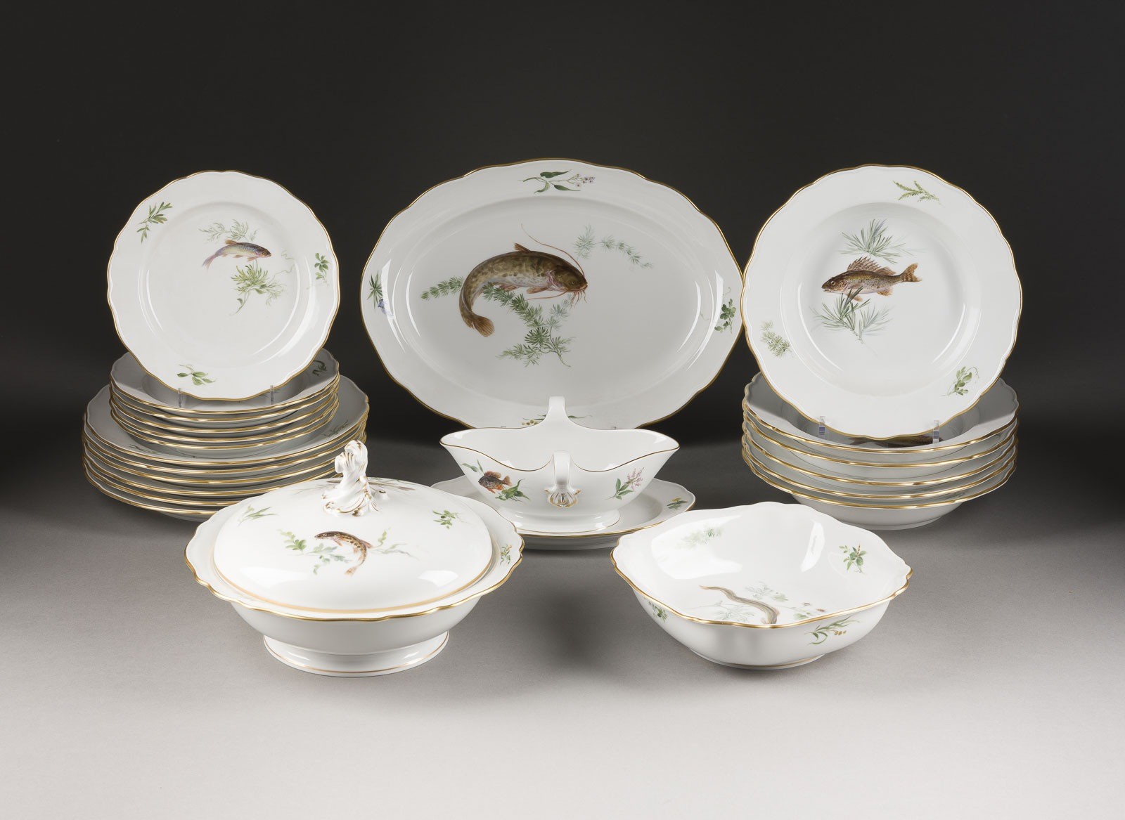 Porzellan, polychrome Malerei, dezente Goldstaffage. L.35,5 cm (Platte), D. 20-25 cm (Teller). Unterglasurblaue Schwertermarke, Press- und Malernummer, part. Jahreszeichen sowie Modellnr. Bestehend aus: 1 Terrine, 1 Platte, 1 Sauciere, 1 eckige Schale, 6 Tellern, 6