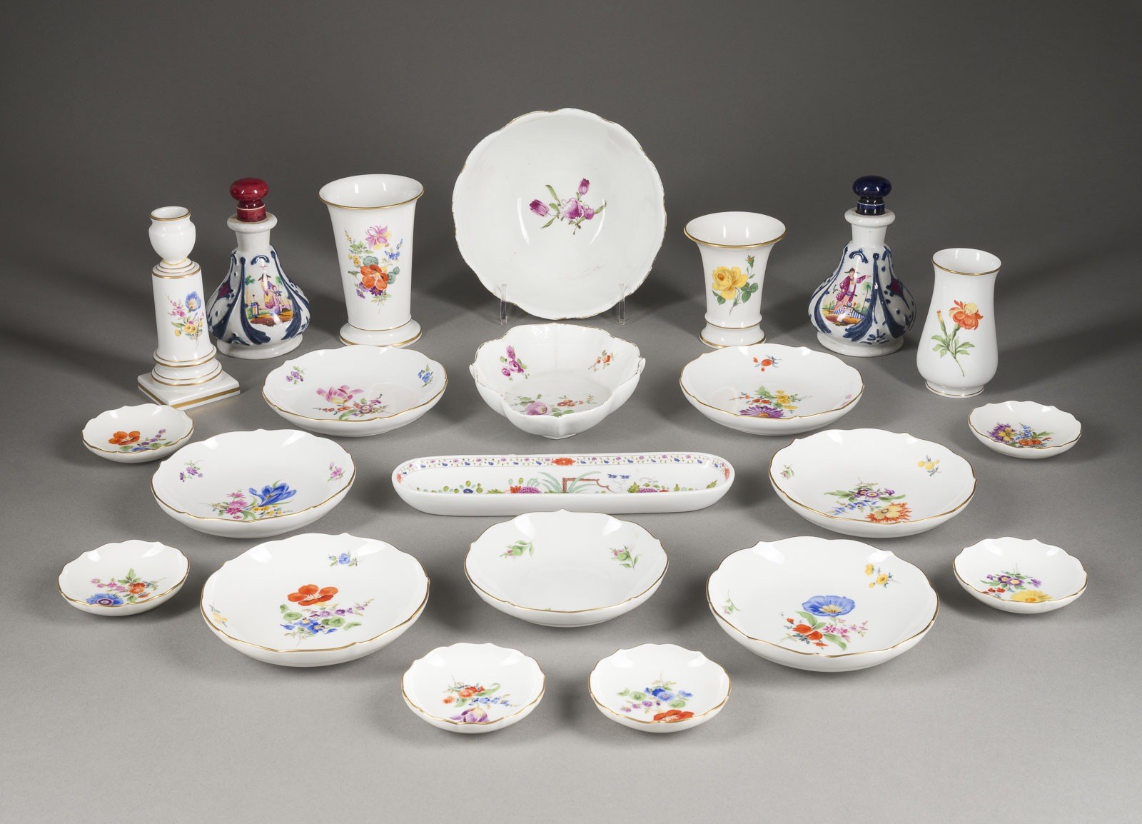 Porzellan, polychrome Malerei, teilw. dezente Goldstaffage. H. 9,7-12,7 cm (Vase), L. 23,5 cm (Schale), H. 17,. Unterglasurblaue Schwertermarke, u.a. unterglasurblaue 'P'. Bestehend aus: 3 Vasen, 7 Untertassen, 6 kleinen Schälchen, 1 langer Schale, 1 runder