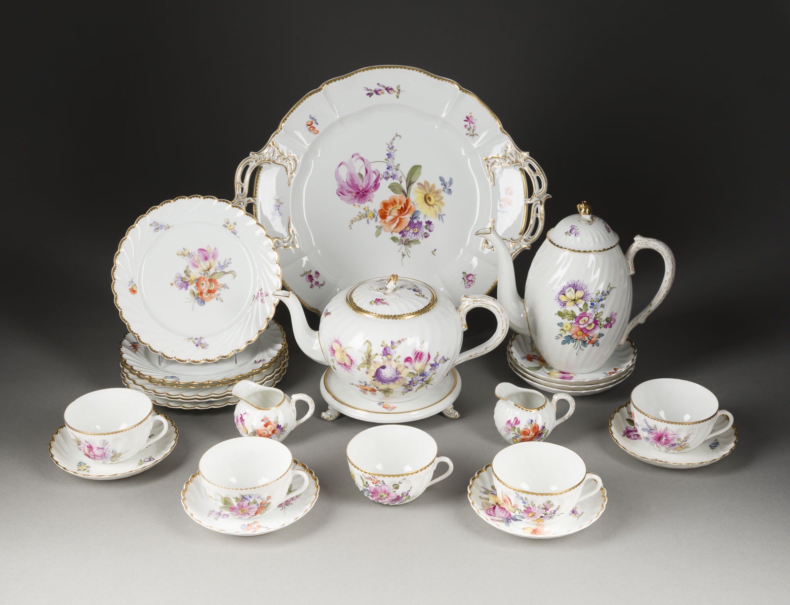 Porzellan, polychrome Malerei, Goldstaffage. D. 32 cm (Henkelplatte), H. 15-19,5 cm (Kanne), D.. Unterglasurgrüner Manufakturstempel, eingepresstes Rautenschild, part. Pressnummer und -zeichen, Pinselnummer. Bestehend aus: 1 Teekanne, 1 Kaffeekanne, 1 Henkelplatte, 5 Kaffeetassen mit 7