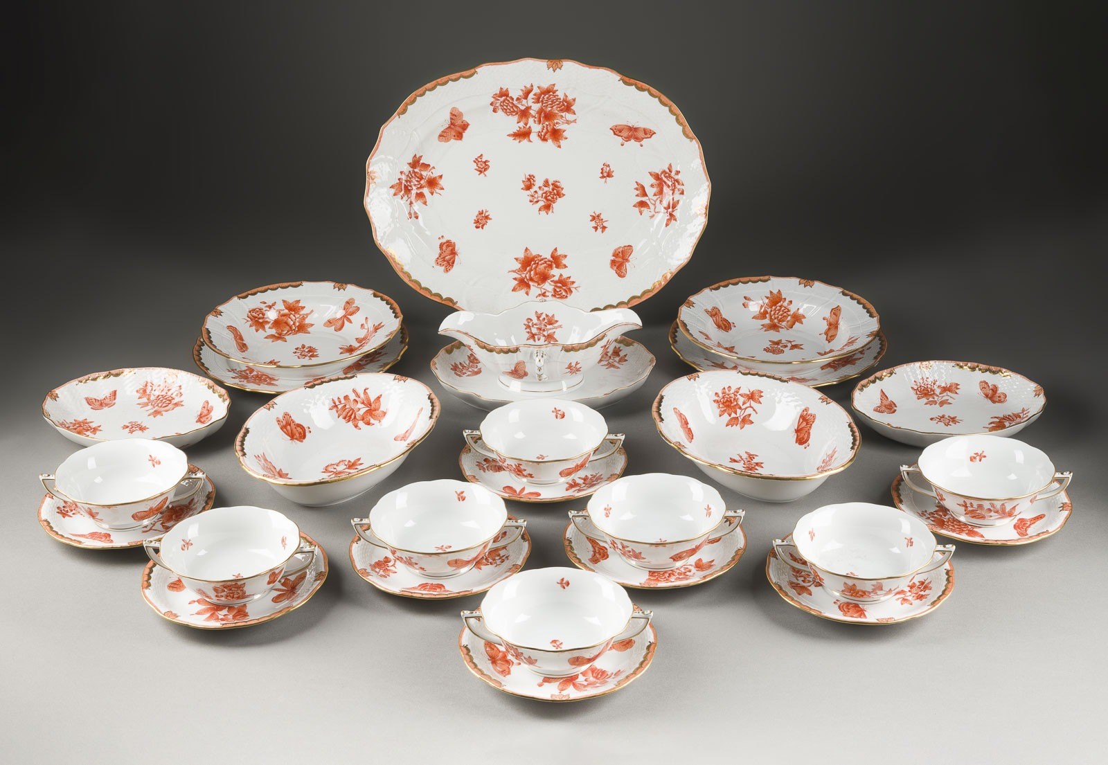 Porzellan, Camaieumalerei, Goldstaffage. L. 22-42 cm (Schalen). Aufglasurblauer Manufakturstempel, Dekorzeichen, Maler- und Modellnr. Bestehend aus: 1 Sauciere, 8 Suppentassen mit 8 Untertassen, 2 Suppentellern, 2