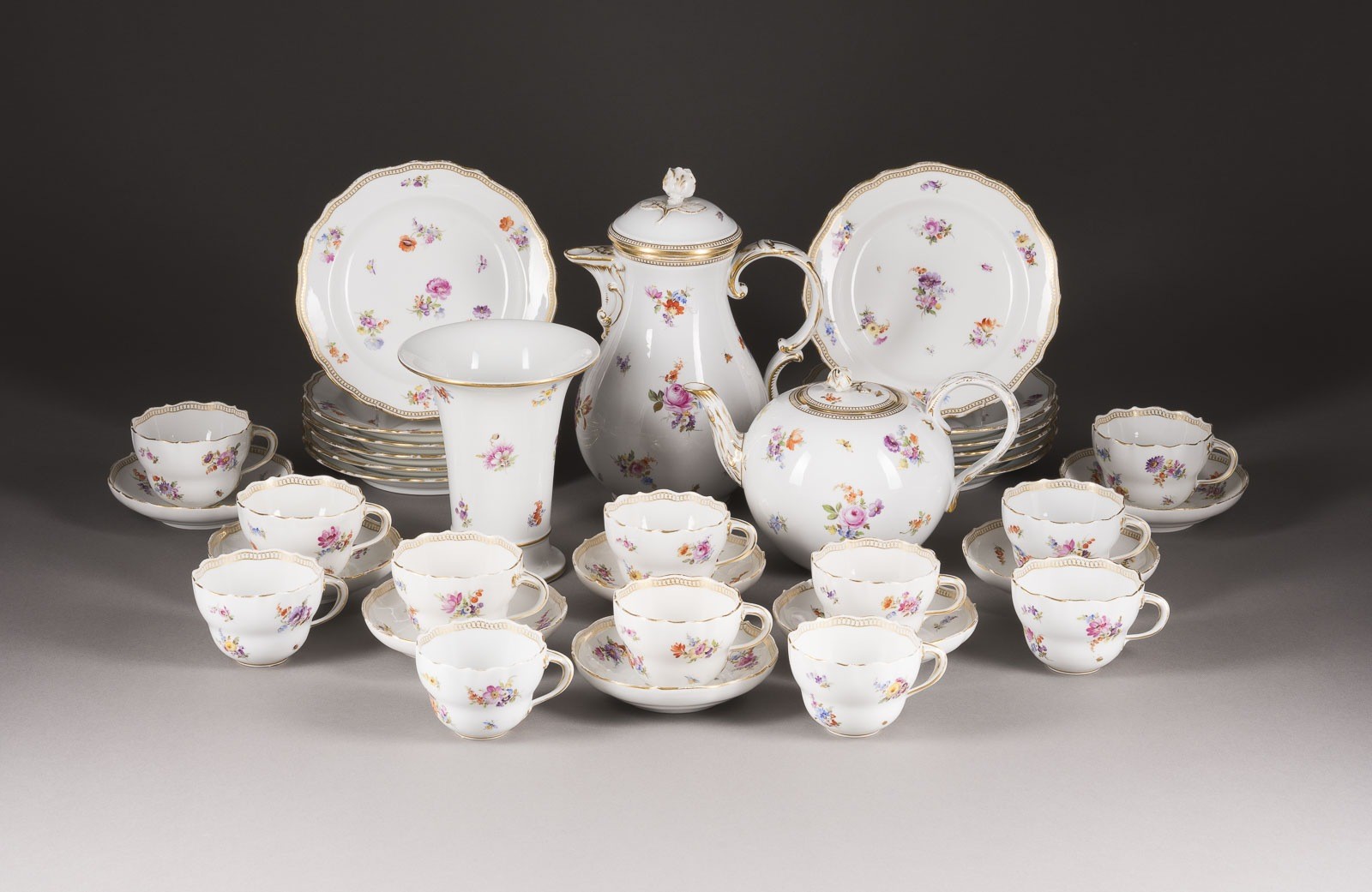 Porzellan, polychrome Malerei, Goldstaffage. H. 26,5 cm (Kaffeekanne), H. 15,5 cm (Teekanne). Unterglasurblaue Knaufschwerter, Press- und Malernummer. Bestehend aus: 1 Kaffeekanne, 1 Teekanne, 1 Vase, 12 Tassen mit 8 Untertassen, 12