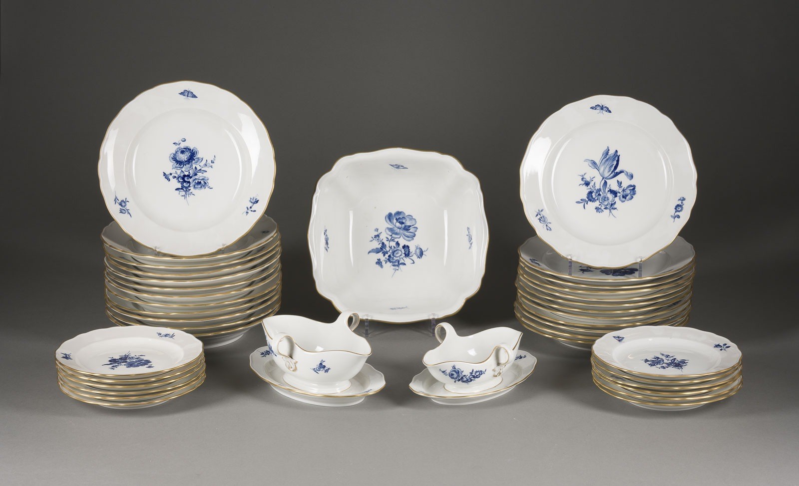 Porzellan, Blaumalerei, Goldstaffage. B. 26 cm (Kartoffelschüssel), D. 20,5-25,5 cm (Tel. Unterglasurblaue Schwertermarke, Press- und Modellnr. Bestehend aus: 2 Saucieren, 1 Kartoffelschüssel, 12 Tellern, 12 Suppentellern, 12
